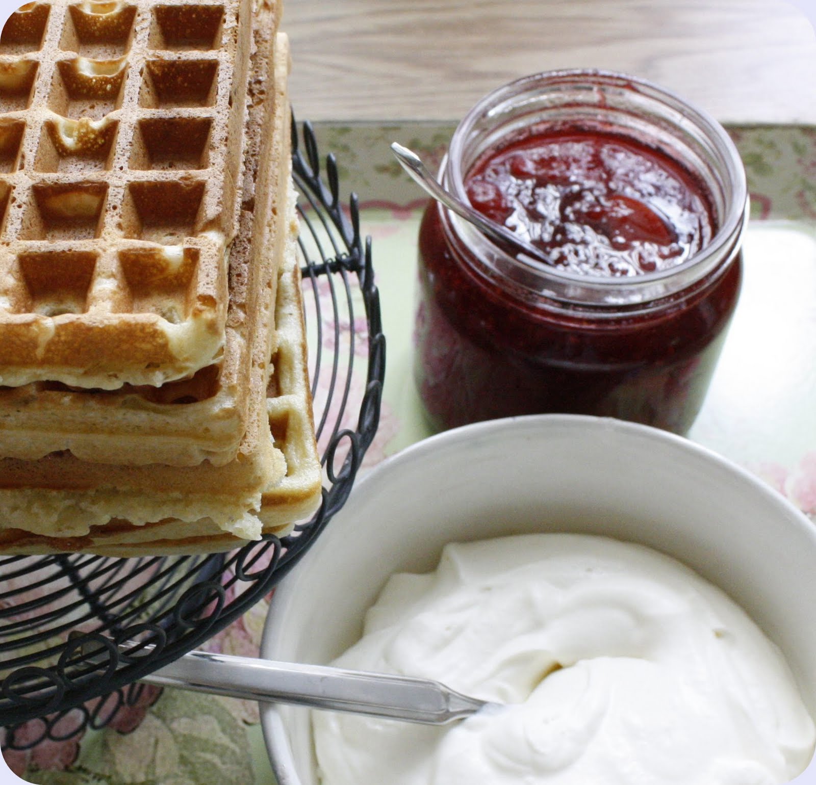Sever gjerne syltetøyet til vafler og pisket krem.