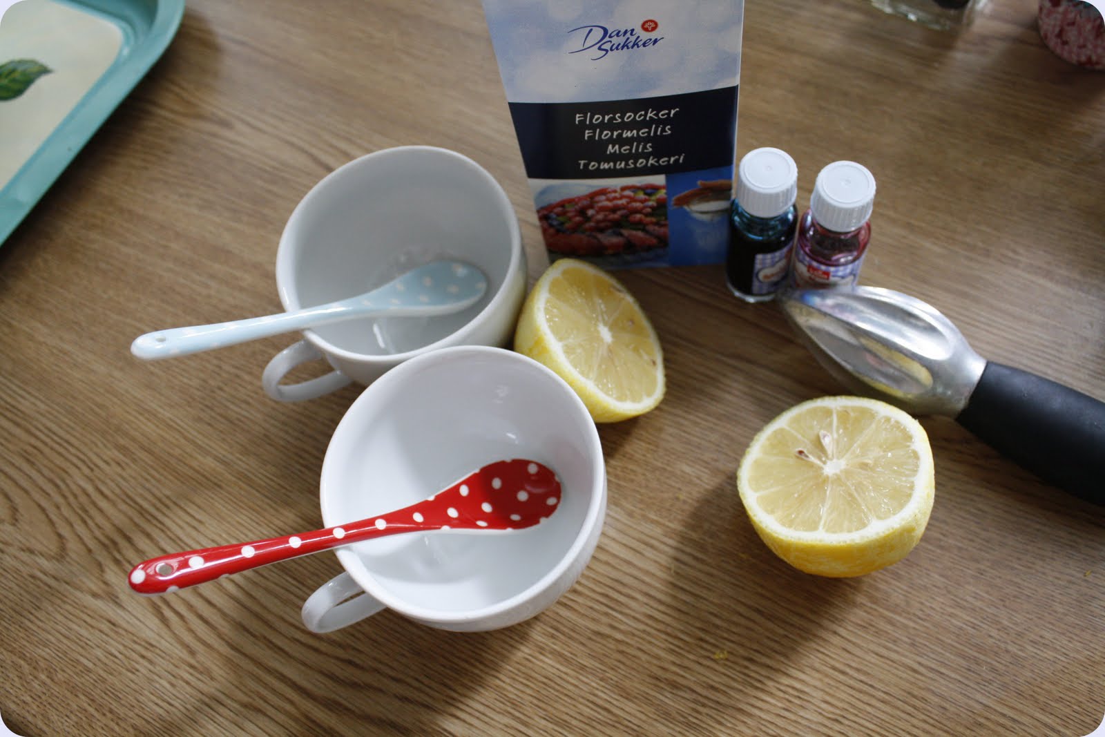 Ha vel 1 dl melis en god sprut med sitron 2 dråper