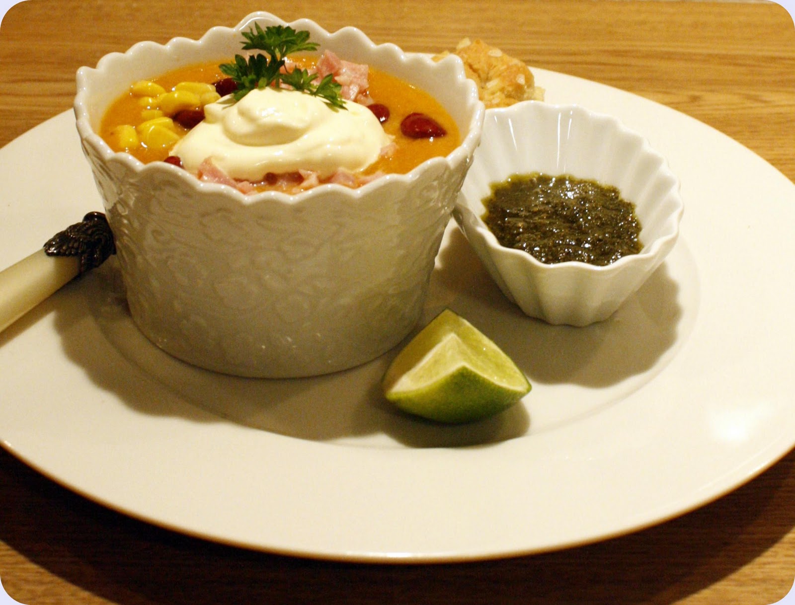 Rømme, bønner, mais, stekt bacon,