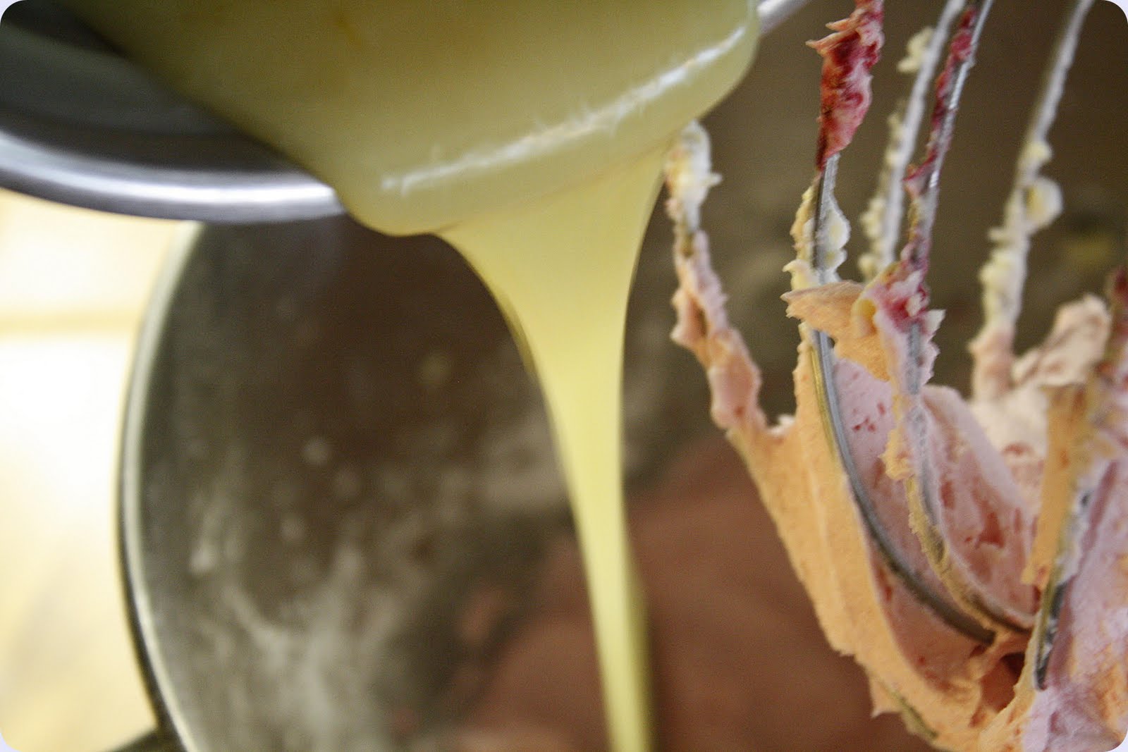 Pisk opp 50 g smør, tilsett 300 g melis og 1 ss sitronsaft.