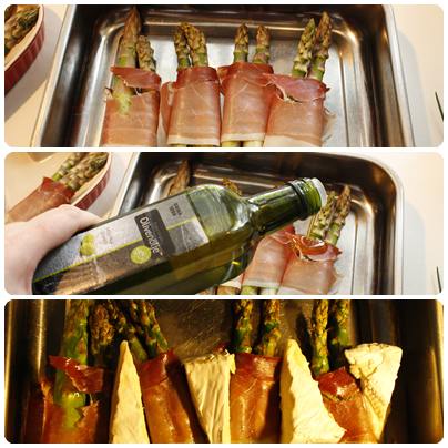 Bind sammen 2 eller 3 asparges med en skive skinke rundt.