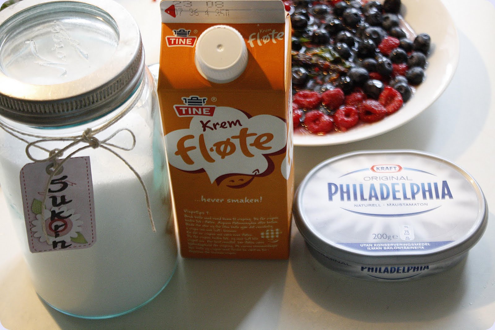 lagvis opp i glass, begynn med bær så krem så bær igjen …..