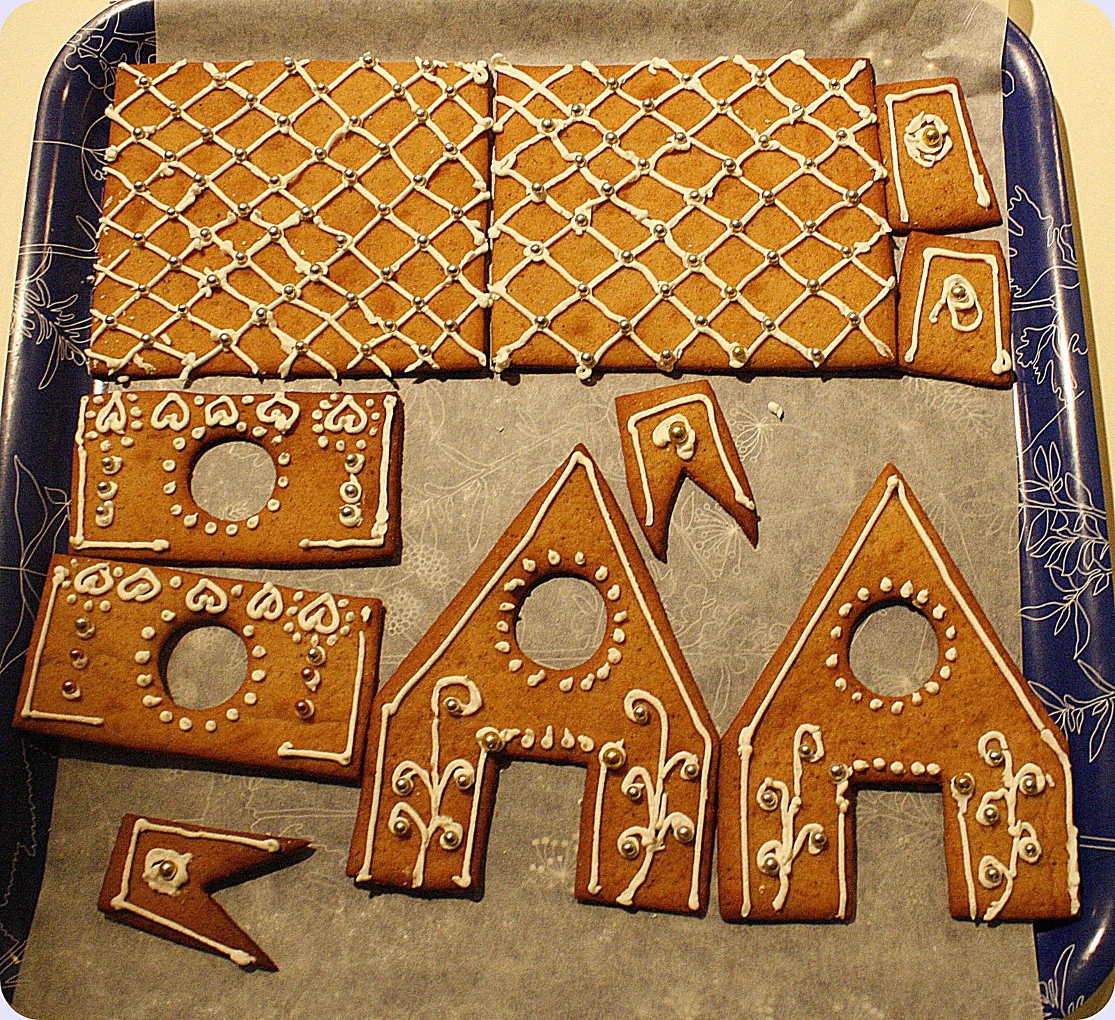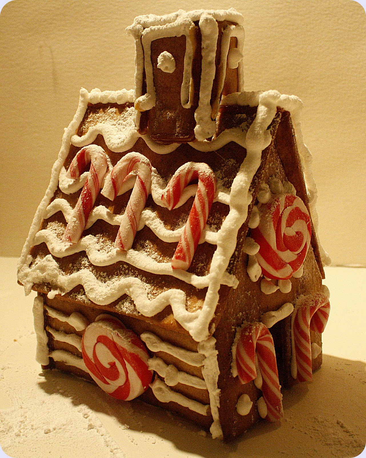 Best av alt likte jeg ditt råd om å dekorere før huset ble satt sammen, det funket strålende! Vi har i løpet av årene gitt om å bruke smeltet sukker som lim, og heller brukt limpistol (!), fordi det ble så mye frustrasjon når sukkeret stivnet for fort osv. Vi tok nmlig alltid på sukkeret med sleiv. Men ditt tips om å smelte sukkeret i ei bred panne og heller dyppe veggene pent i panna, funket optimalt!! Et tredje tips jeg fikk av bloggen din var å kjevle ut deigen rettpå bakepapiret, slik at det ikke ble noe frustrasjon med å flytte delene fra A til B.