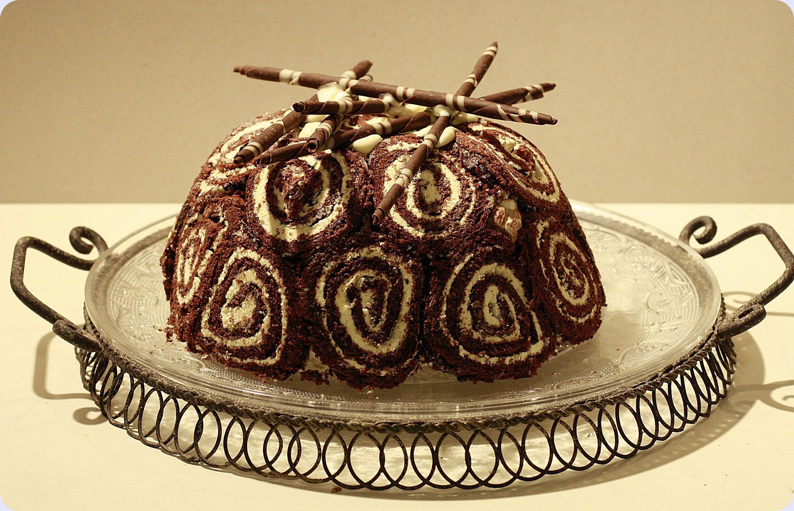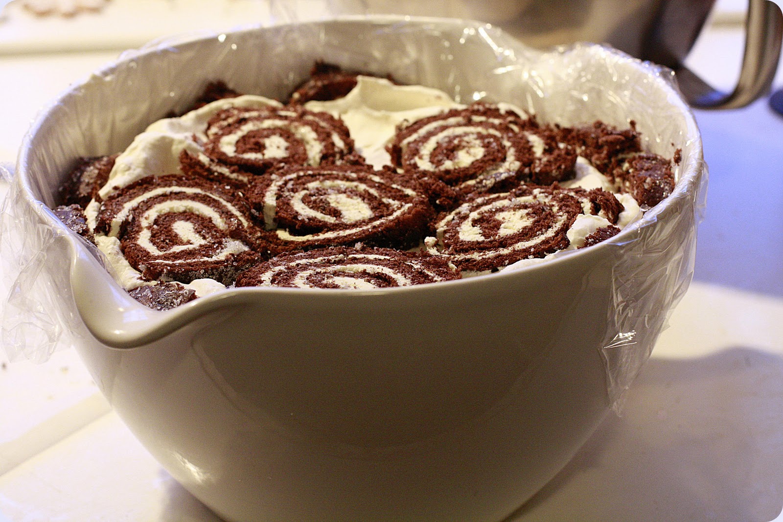 Skjær sjokoladerullekaka i ca 1 cm tykke skiver.