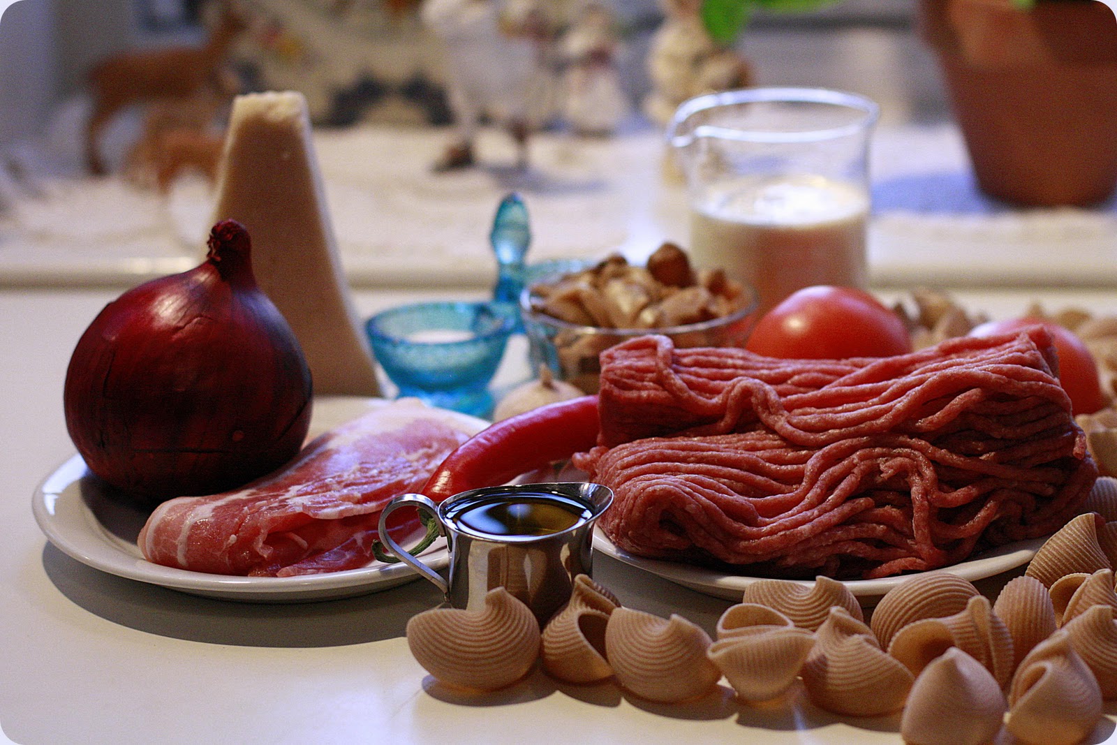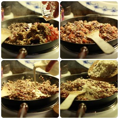 Hell 1 ss olje i stekepanna og stek bacon og kjøttdeig.