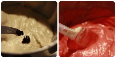 Ta av halvparten av røra og bland i litt rød matfarge.