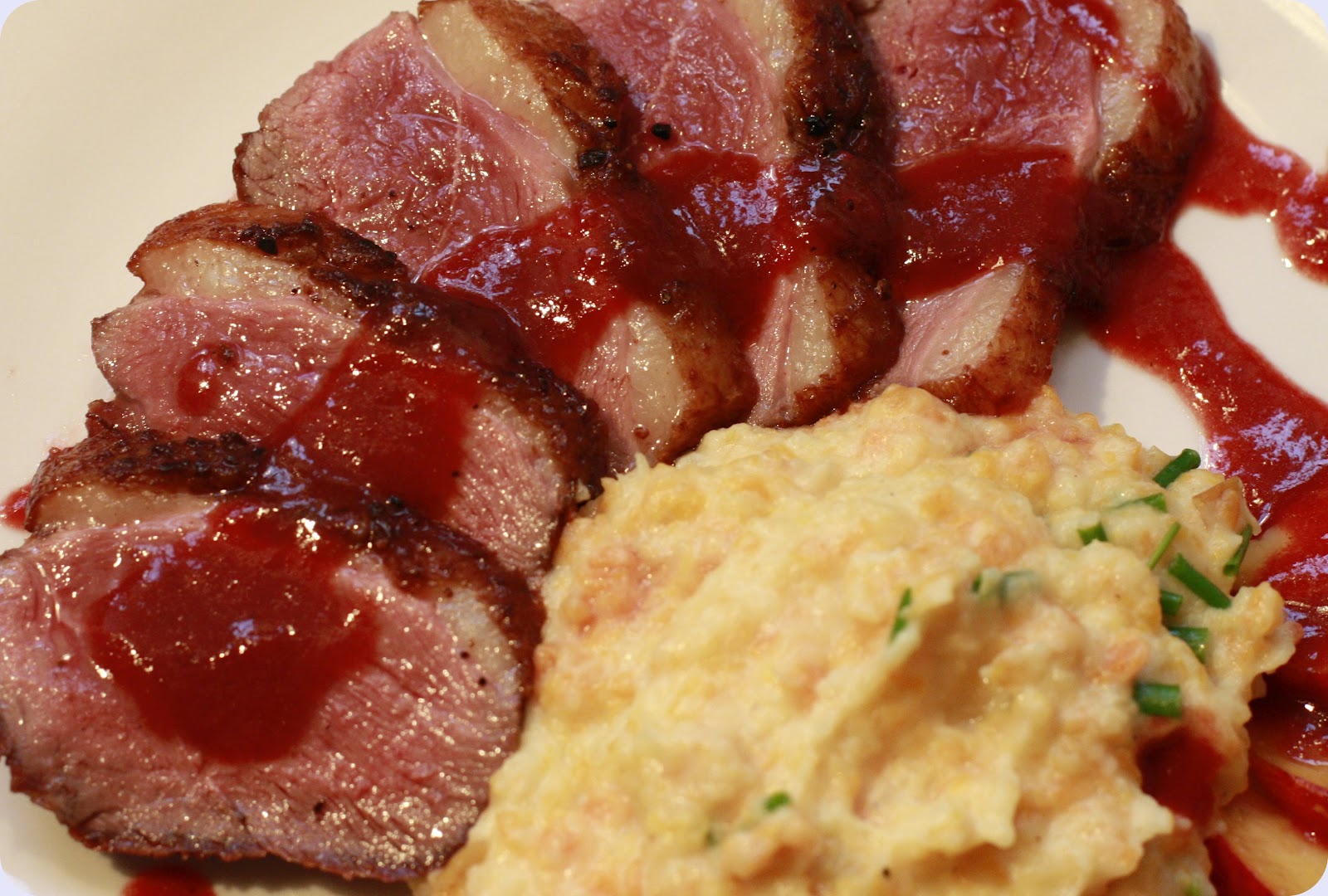 Server skiver av andebryst med rotmosen, den røde sausen og nekarinskiver til.
