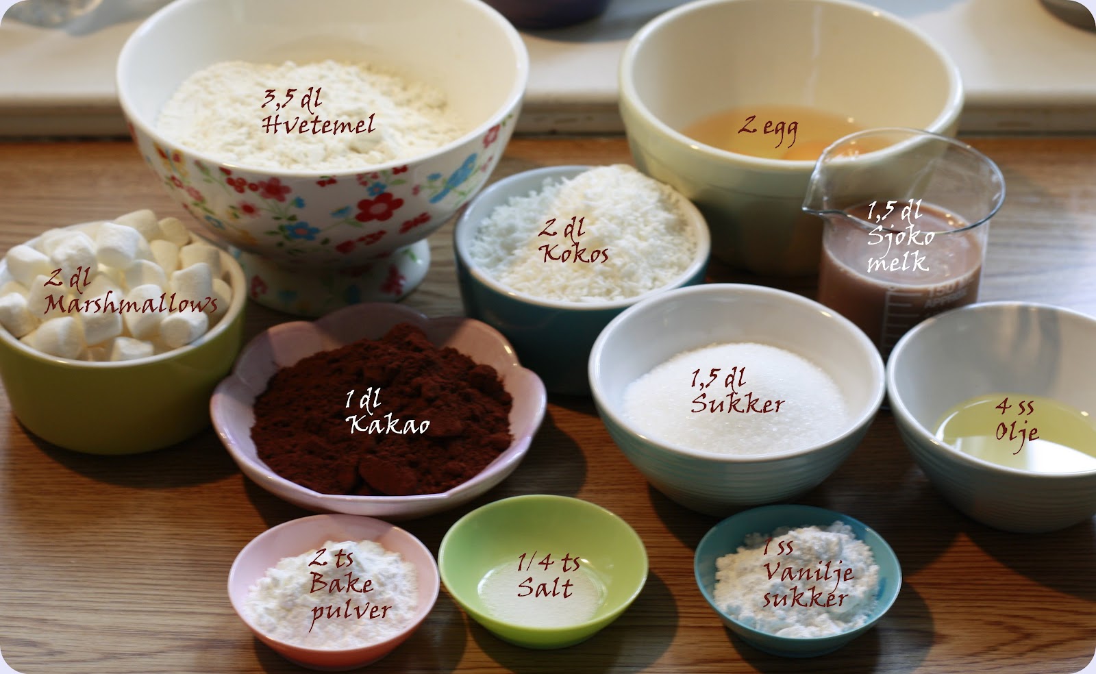 salt og vaniljesukker i melet, blander det, og heller det i bakebollen.
