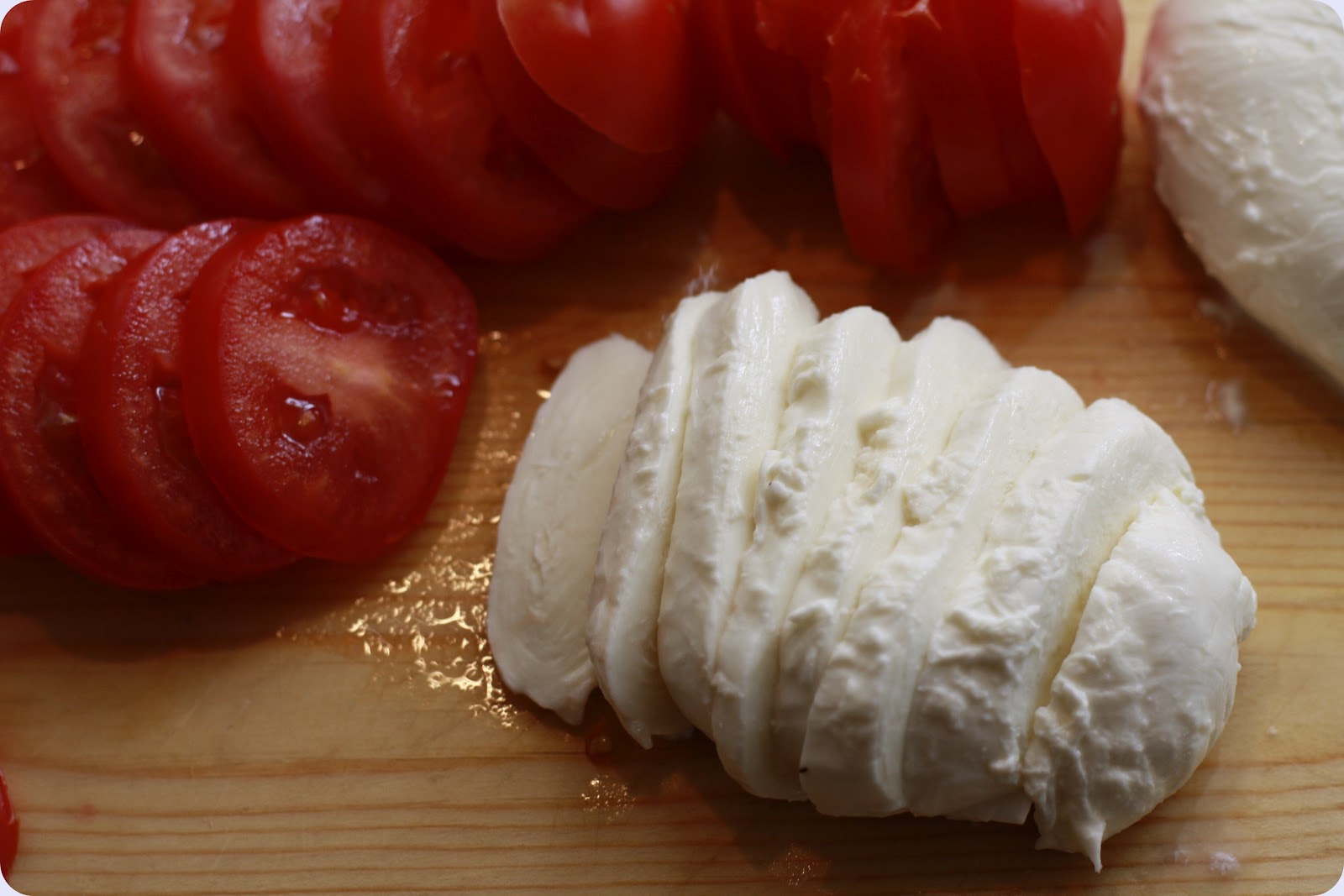 Legg tomat, mozzarella og basilikumblader lagvis på et fat.