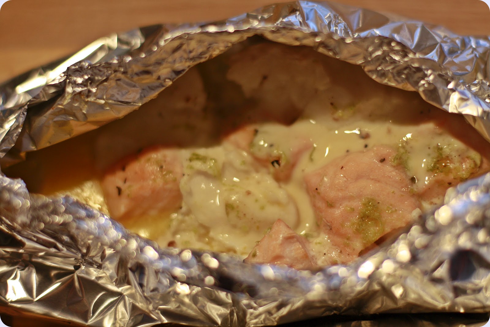 Del opp fisken i kuber, legg de midt på den doble aluminiumsfolien.
