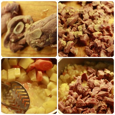 Ha poteter og grønsaker i kasserollen sammen med kjøttet.