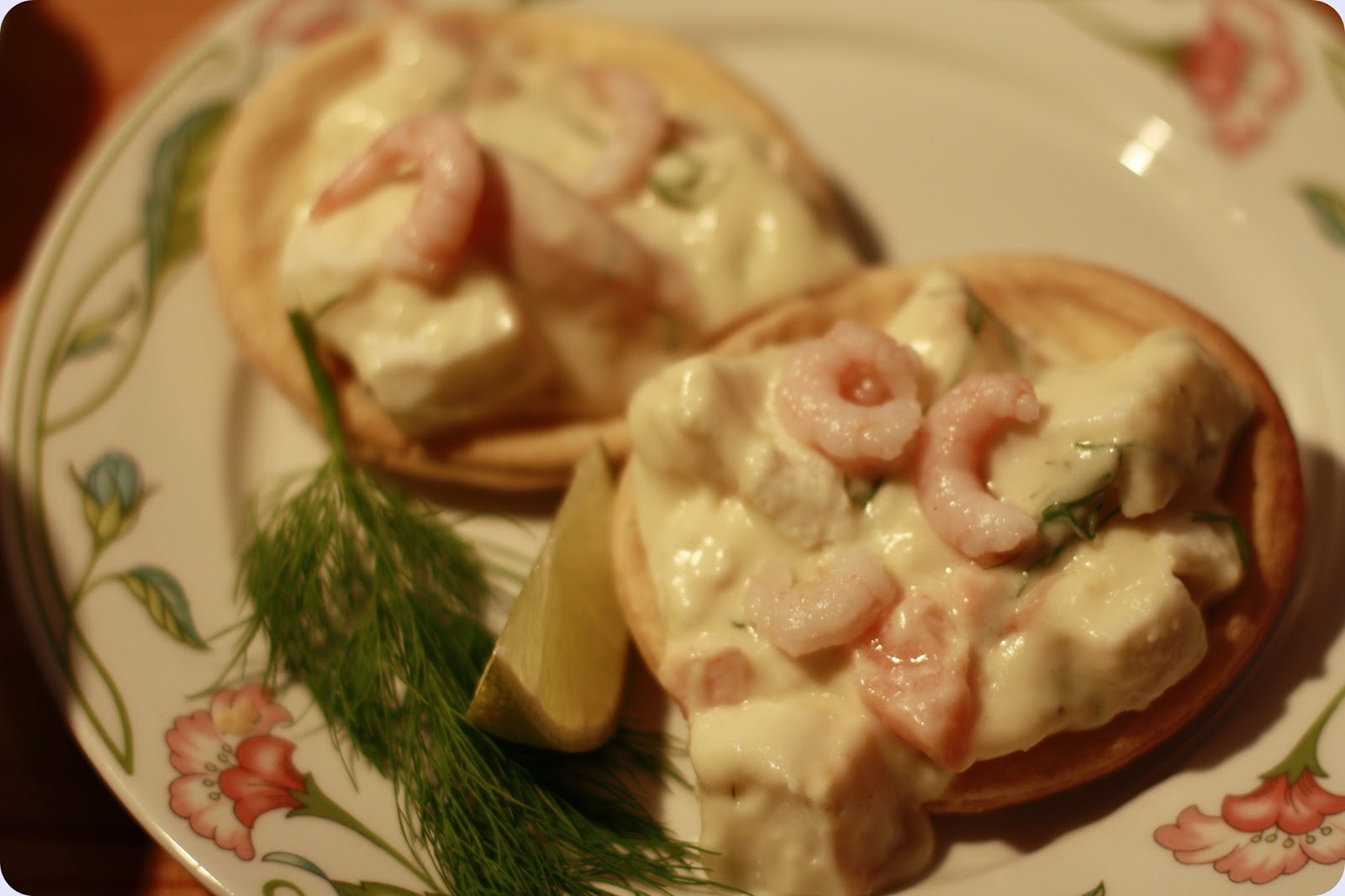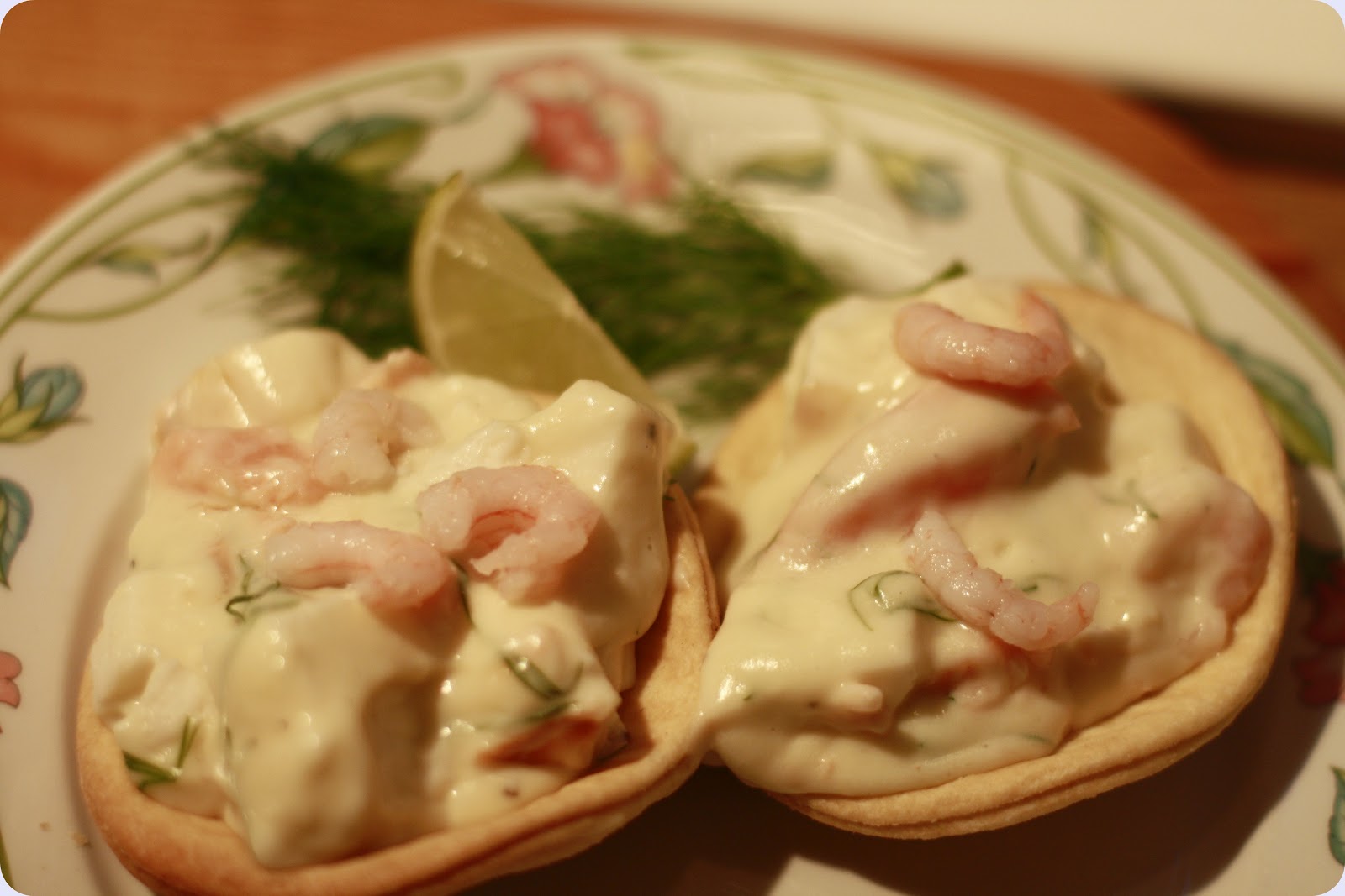 Sprø terteskjell fylt med god hvit saus, reker, fiskepudding, laks og dill.