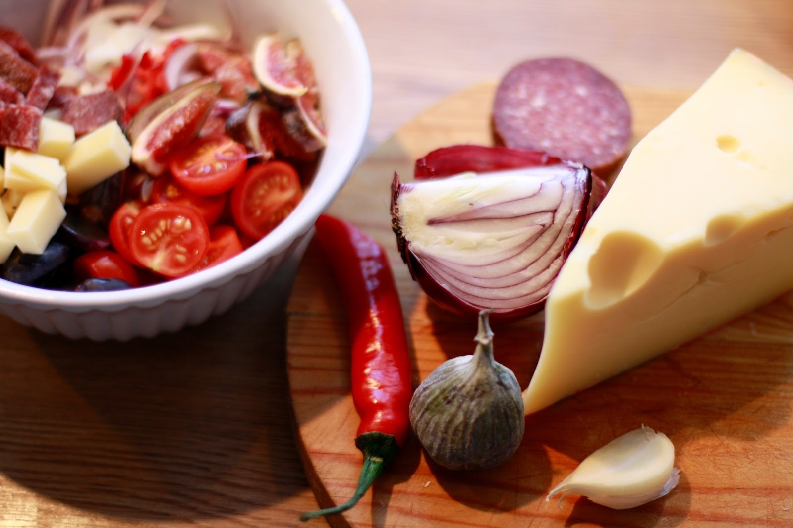 Del opp ost og spekepølse i terninger, del tomat og druer i to.