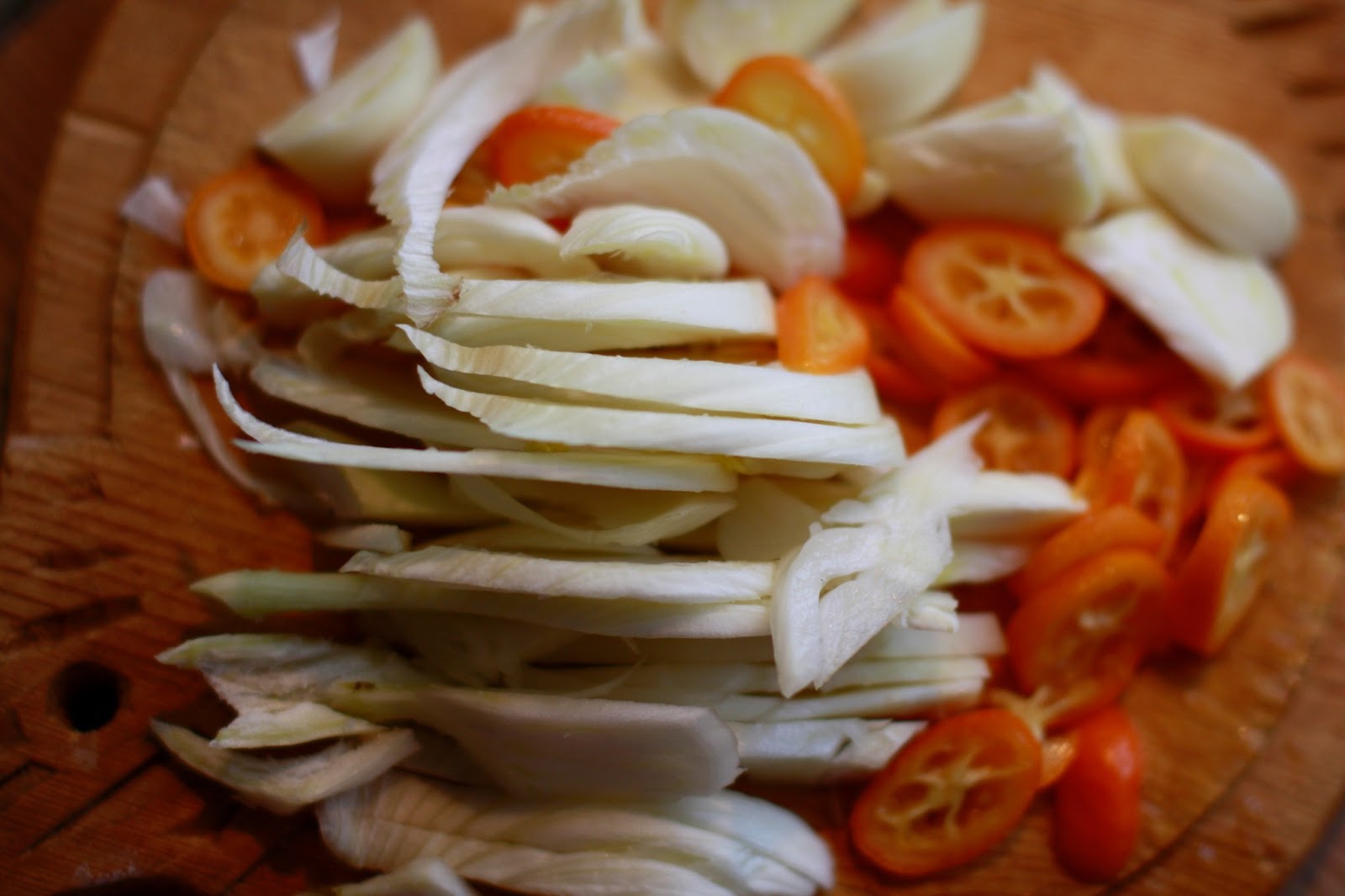 Del opp fenikkel, kumquat og hvitløk i skiver.