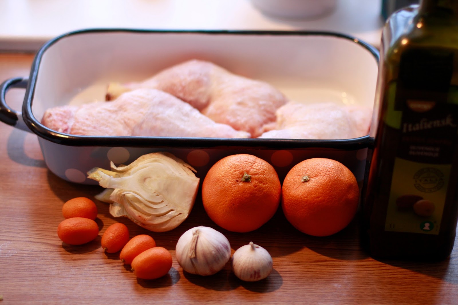 Kyllingen kan stekes dagen før, og varmes opp før den skal spises.
