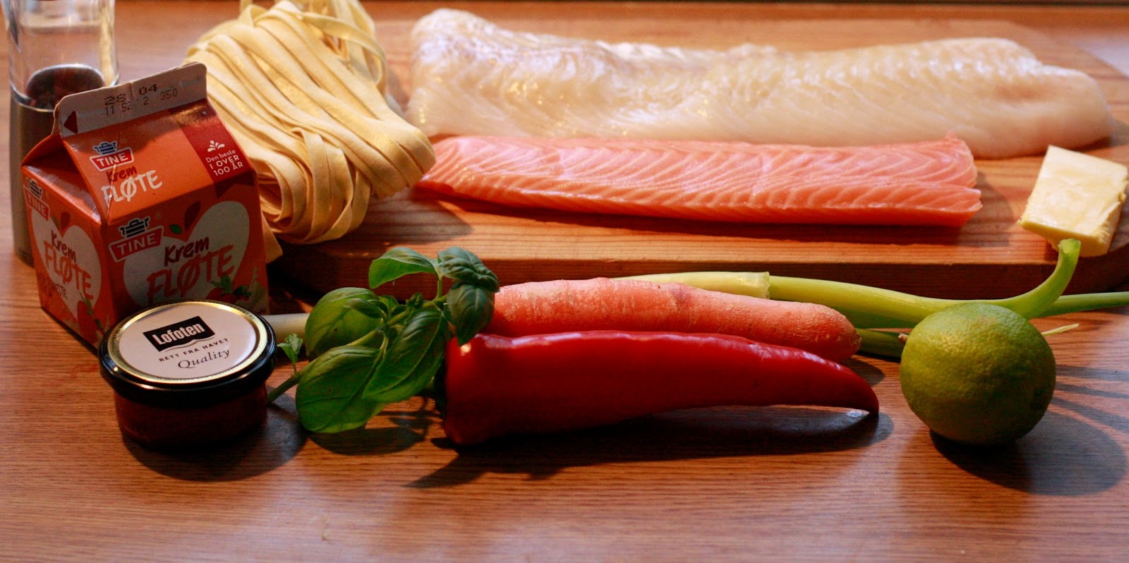 Tilbehør: Limebåter, lodderogn, basilikum og god ost.