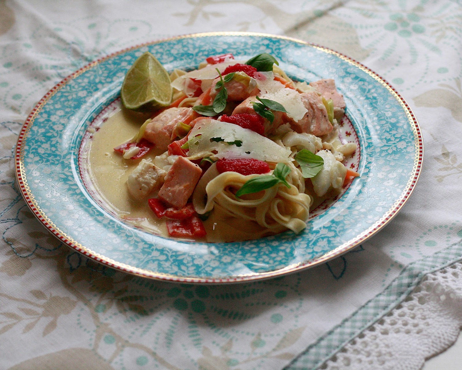 Smak til med lime salt og pepper, vend det forsiktig i gryta,