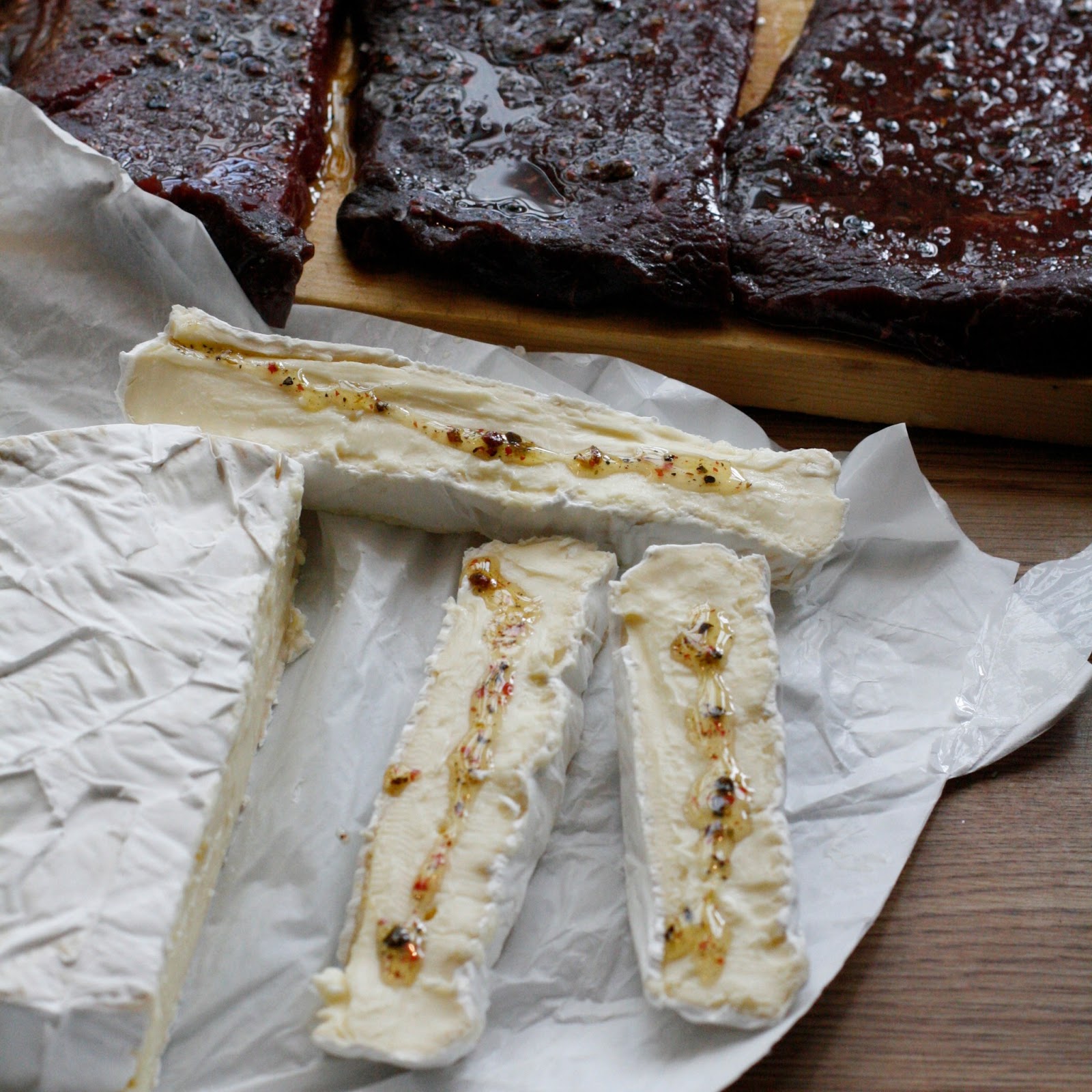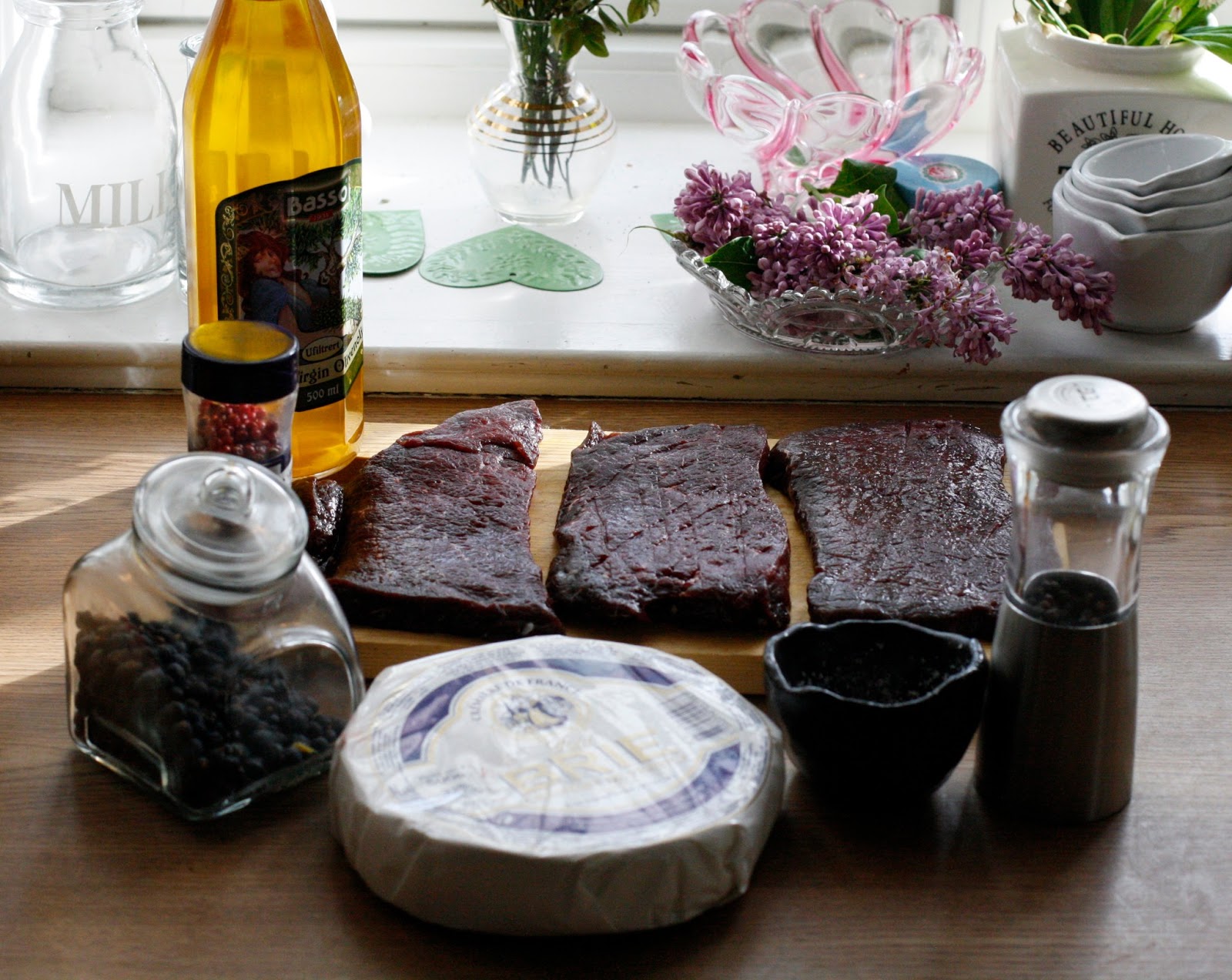 Grillet hvalbiff med brie, krydret med einebær og rosepepper.