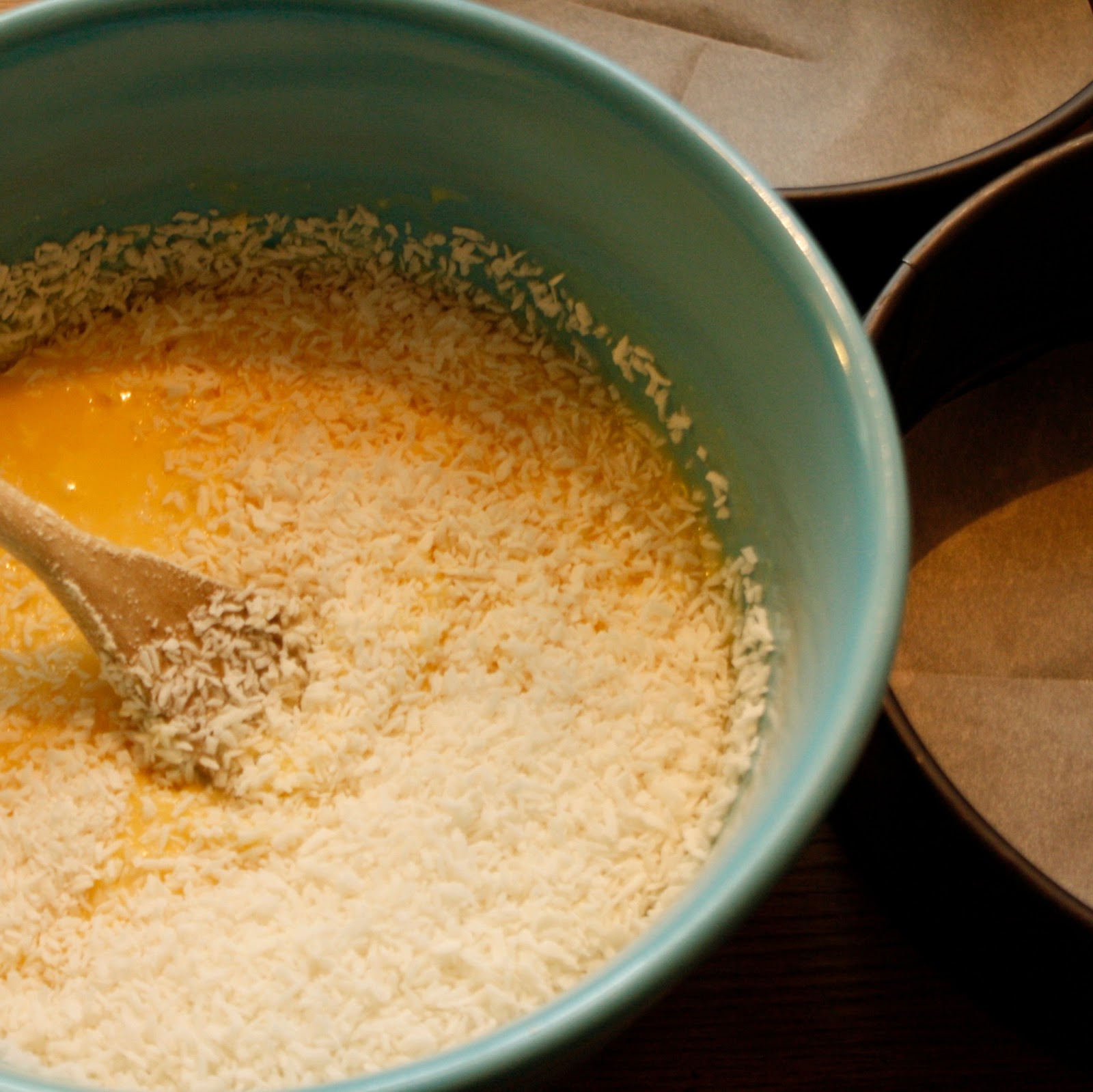 Ha i kokosen og melken, bland til sist inn mel og bakepulver.