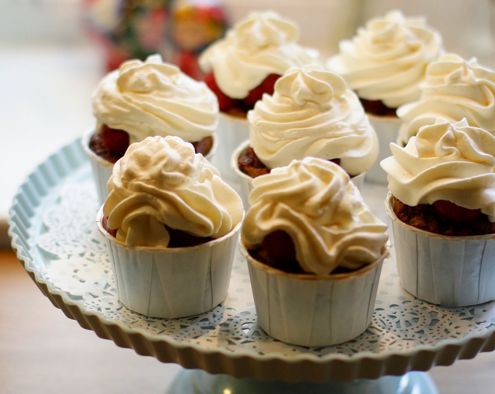 Avkjøl brownies muffinsen, og pisk fløten til krem.