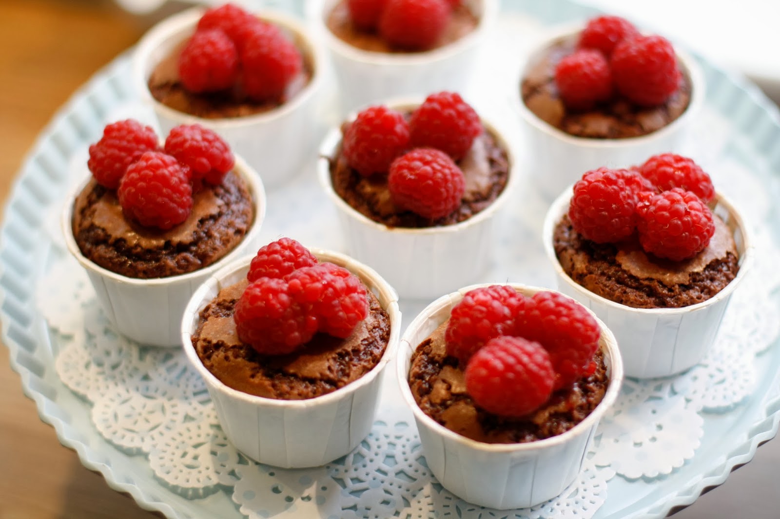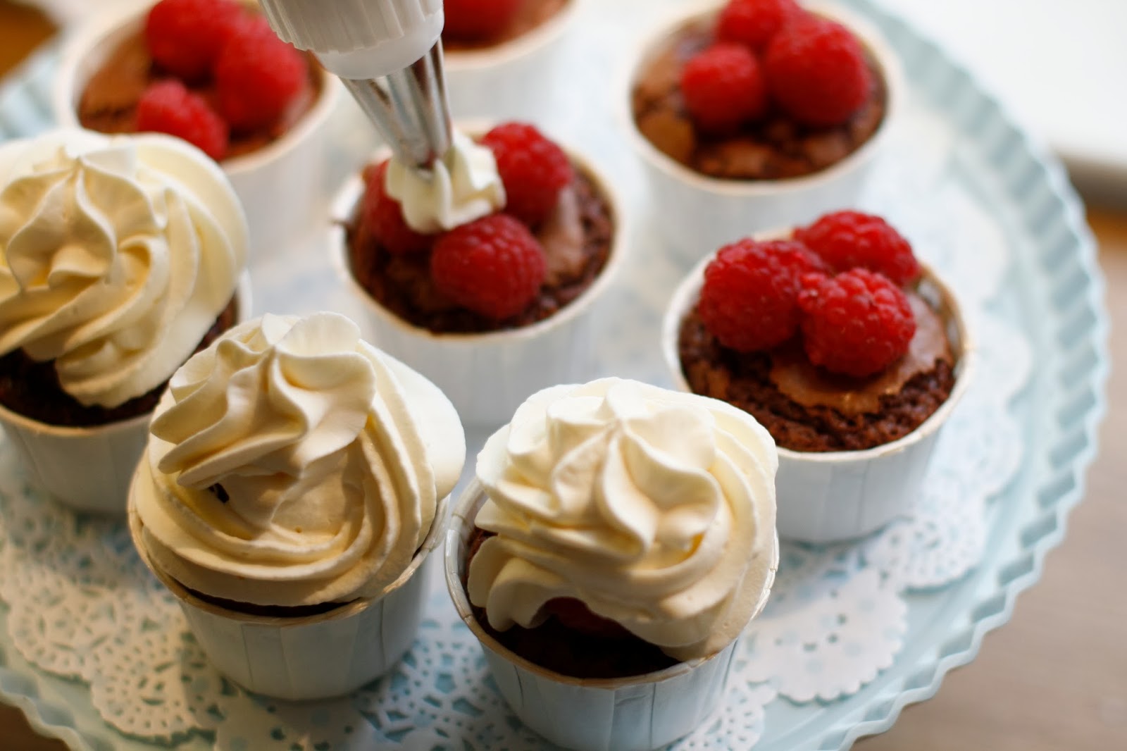Supergode brownies muffins toppet med ferske bringebær og krem.