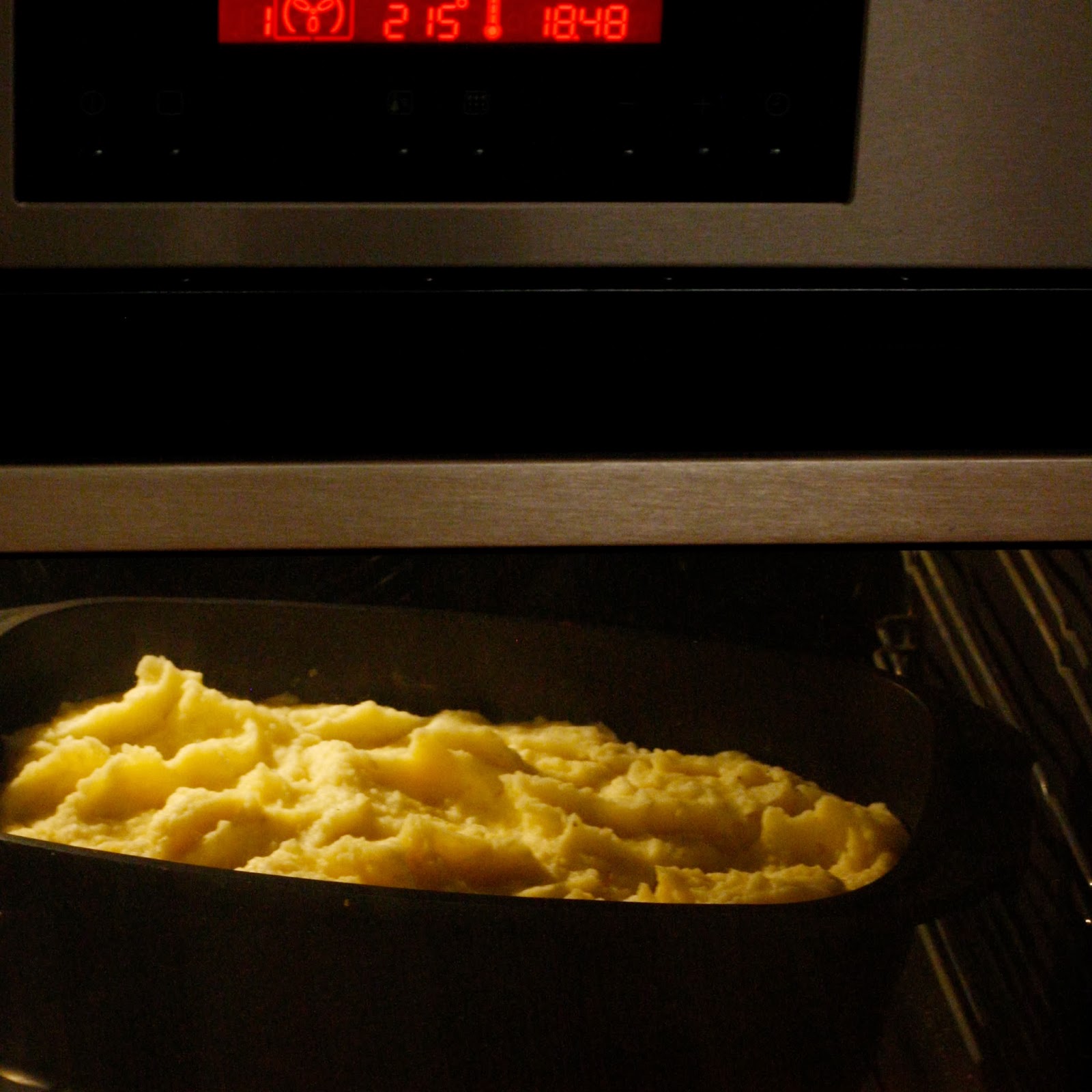 Bre potetmosen over kjøttgryta.
