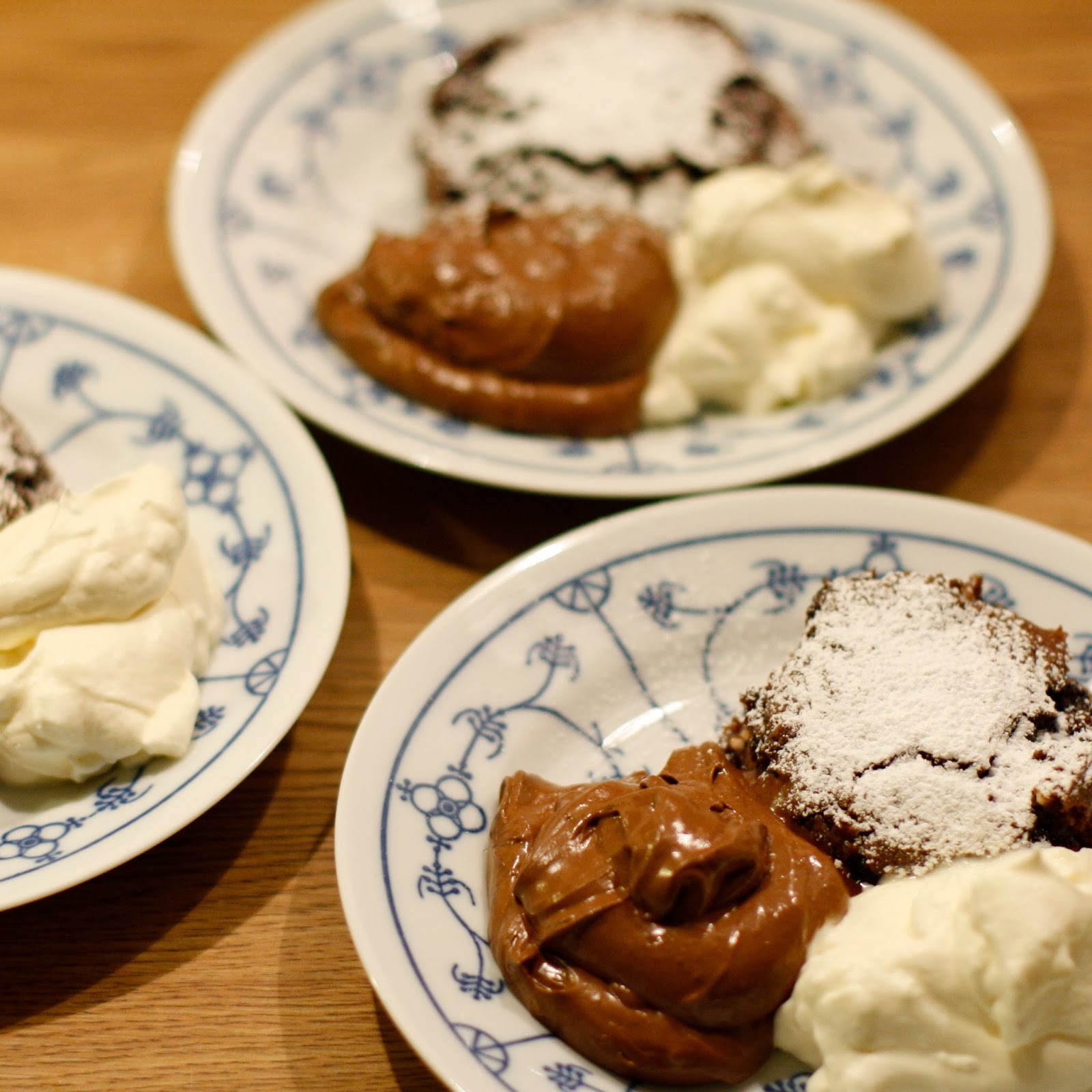 Legg en skje krem og en skje sjokoladekrem på hvert fat.