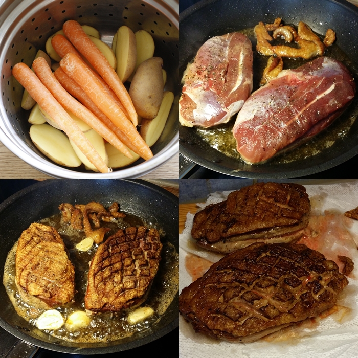 Stek poteter og gulrøtter i andefettet til de er sprøe og gyldne.