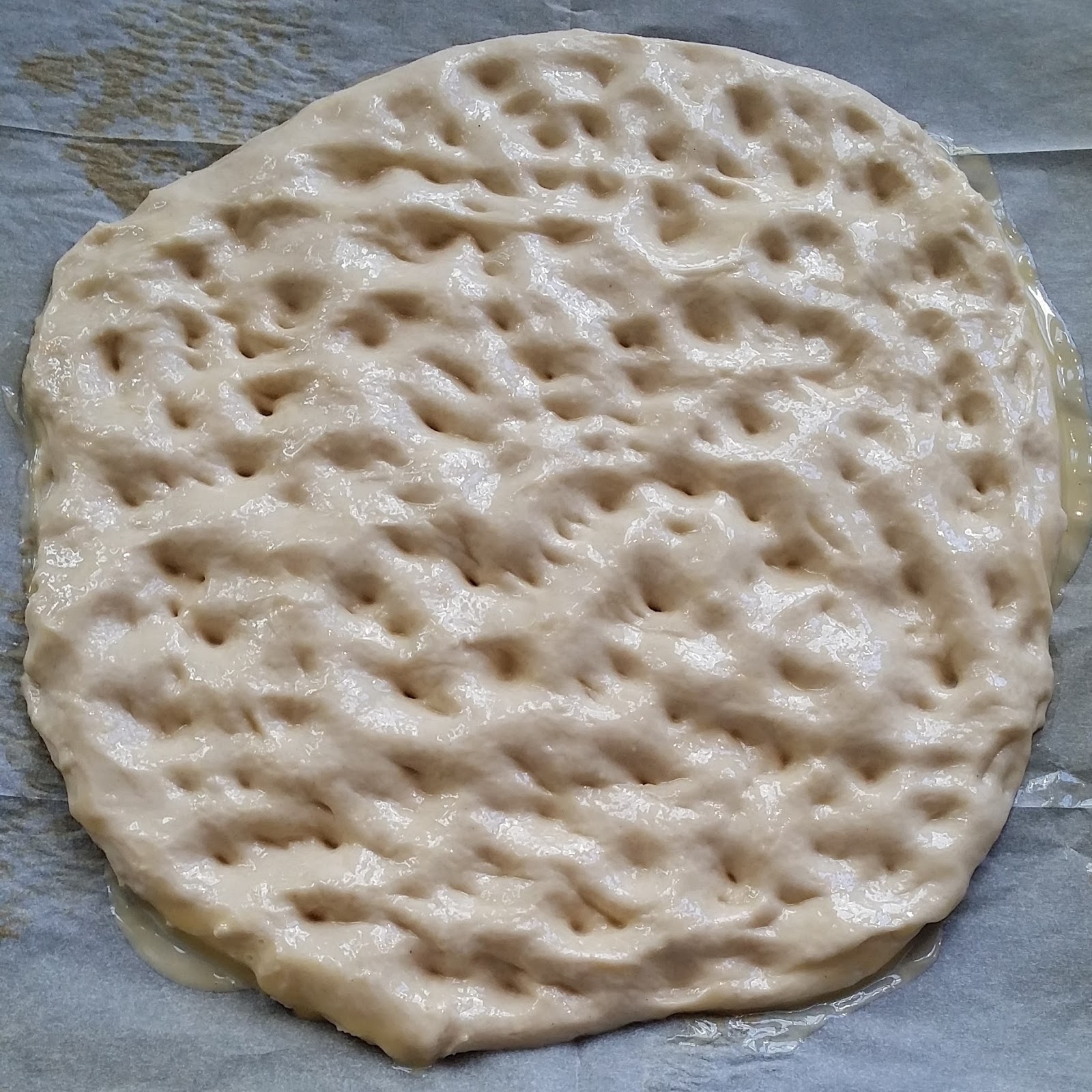 Trykk fingrene ned i deigen så det blir mange små groper.