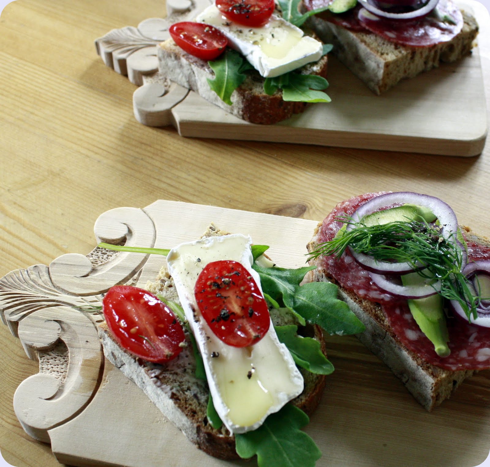 Et med Brie/rukolasalat/plommetomat/pepper/olivenolje.