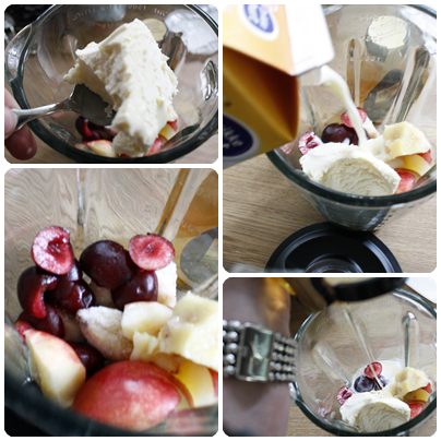 Just made one with strawberries, peach sorbet and club soda, just to use up strawberries and make space in the freezer. The club soda I used just to lower calorie count. Not bad, but I need to work on it. Maybe adding some ice?