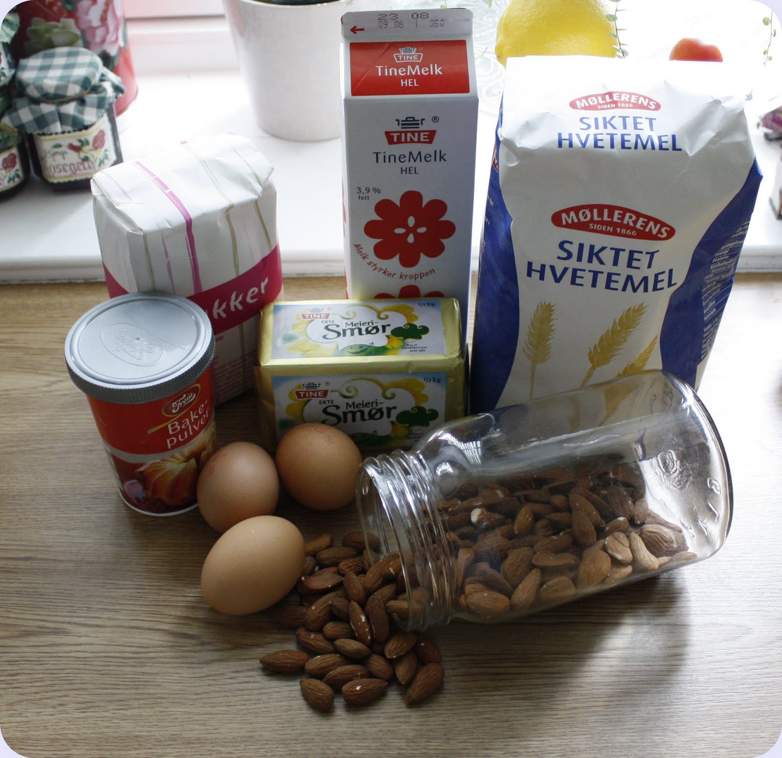 Så mel, bakepulver og melk.