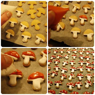 Fyll først stilk og litt under sopphatten med hvit glasur.