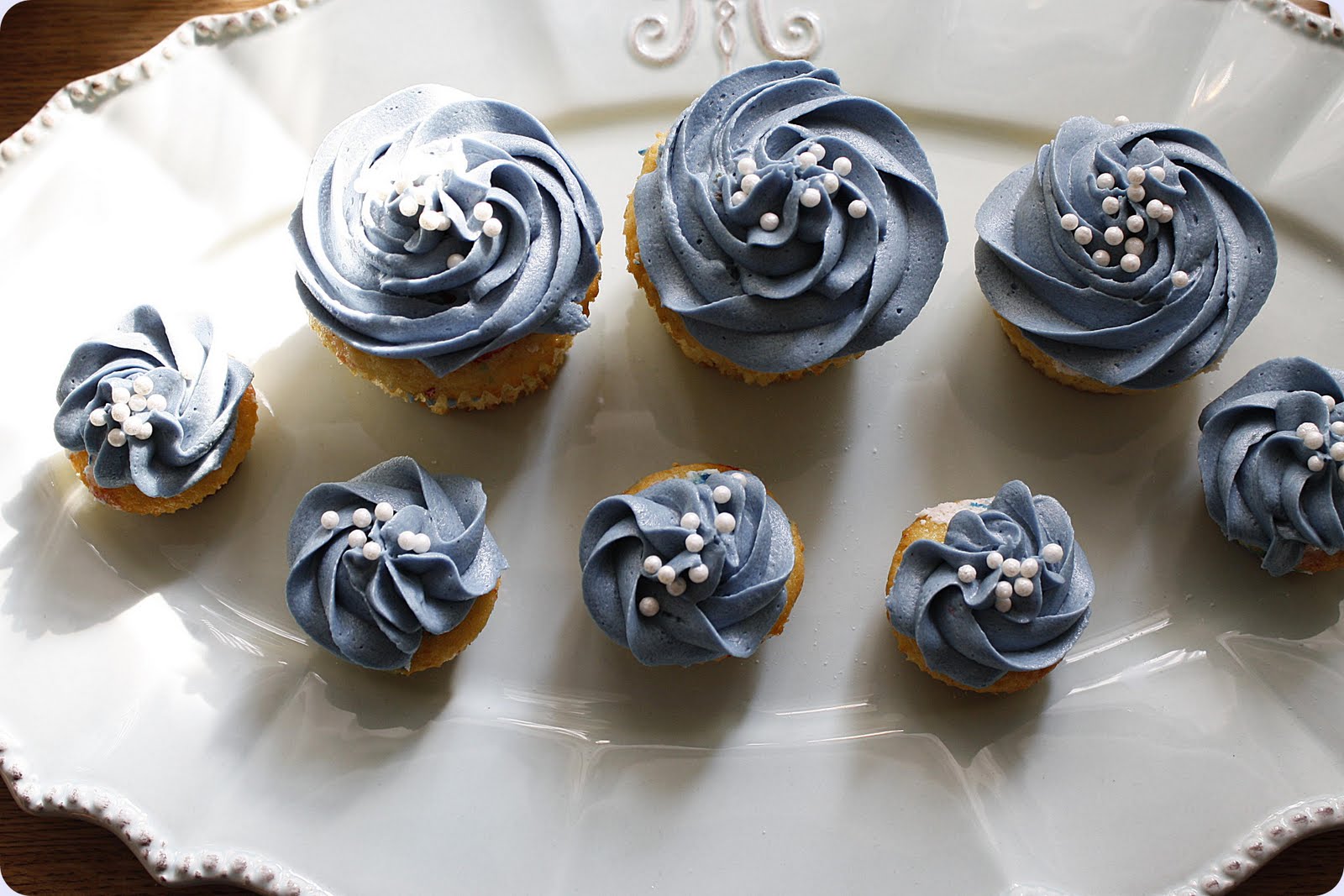 Sprøyt på cupcakene og strø litt hvite sukkerperler på.