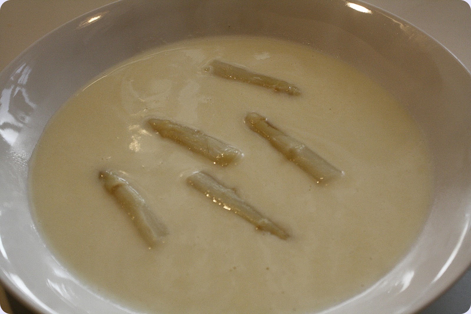 Mos aspargesstilkene i buljongen med en stavmikser.