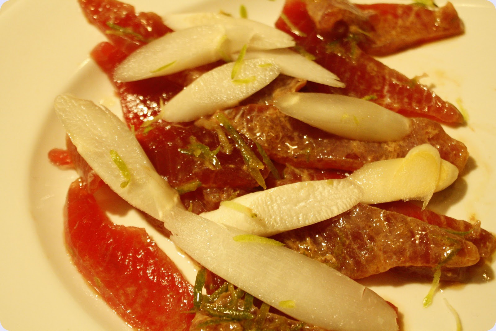 Legg tunfiskbitene på et fat og strø over aspargesen.