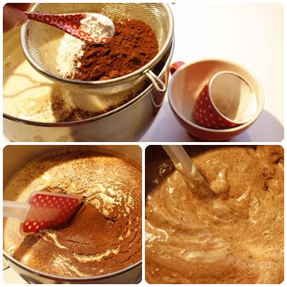 Mål opp mel kakao og bakepulver, og sikt det i eggedosisen.