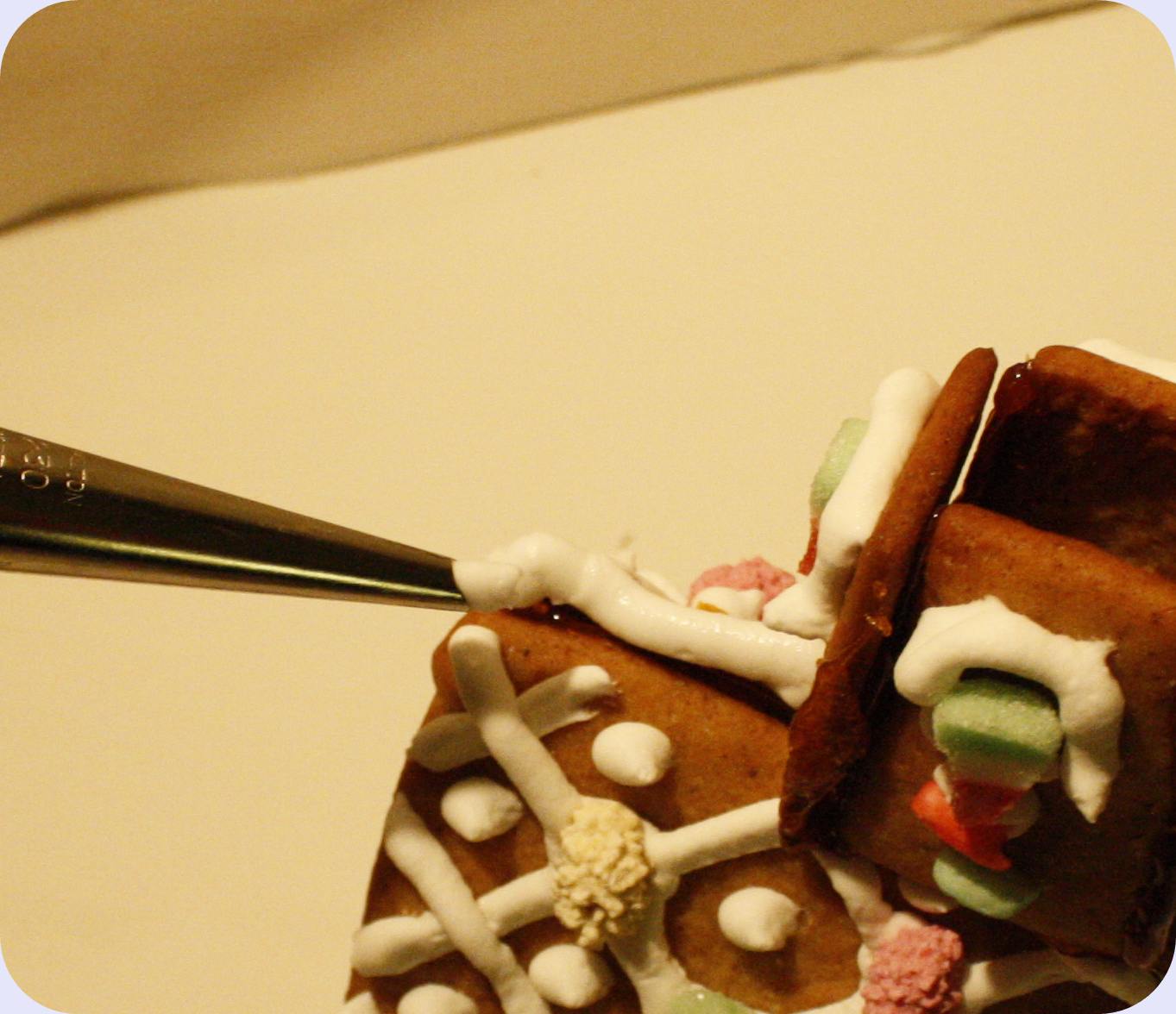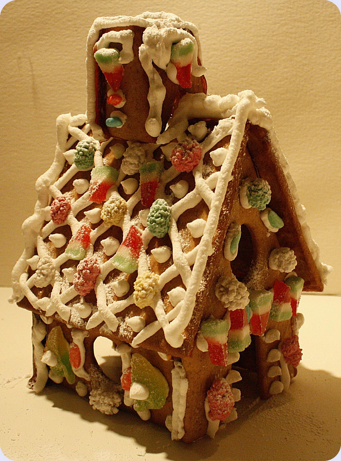 Best av alt likte jeg ditt råd om å dekorere før huset ble satt sammen, det funket strålende! Vi har i løpet av årene gitt om å bruke smeltet sukker som lim, og heller brukt limpistol (!), fordi det ble så mye frustrasjon når sukkeret stivnet for fort osv. Vi tok nmlig alltid på sukkeret med sleiv. Men ditt tips om å smelte sukkeret i ei bred panne og heller dyppe veggene pent i panna, funket optimalt!! Et tredje tips jeg fikk av bloggen din var å kjevle ut deigen rettpå bakepapiret, slik at det ikke ble noe frustrasjon med å flytte delene fra A til B.