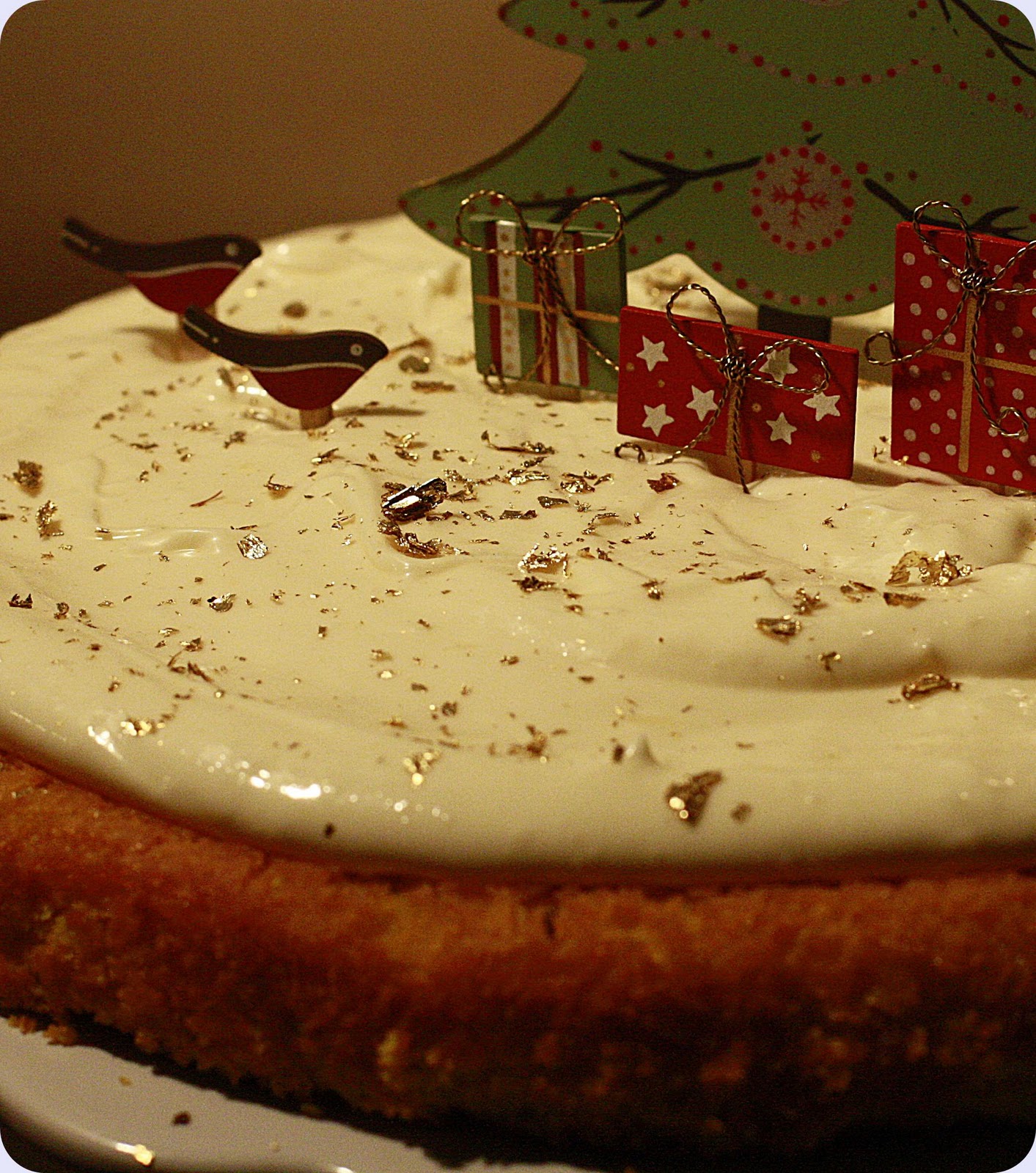 Safranbrownie med hvit sjokolade, toppet med ostekrem gull og julepynt.