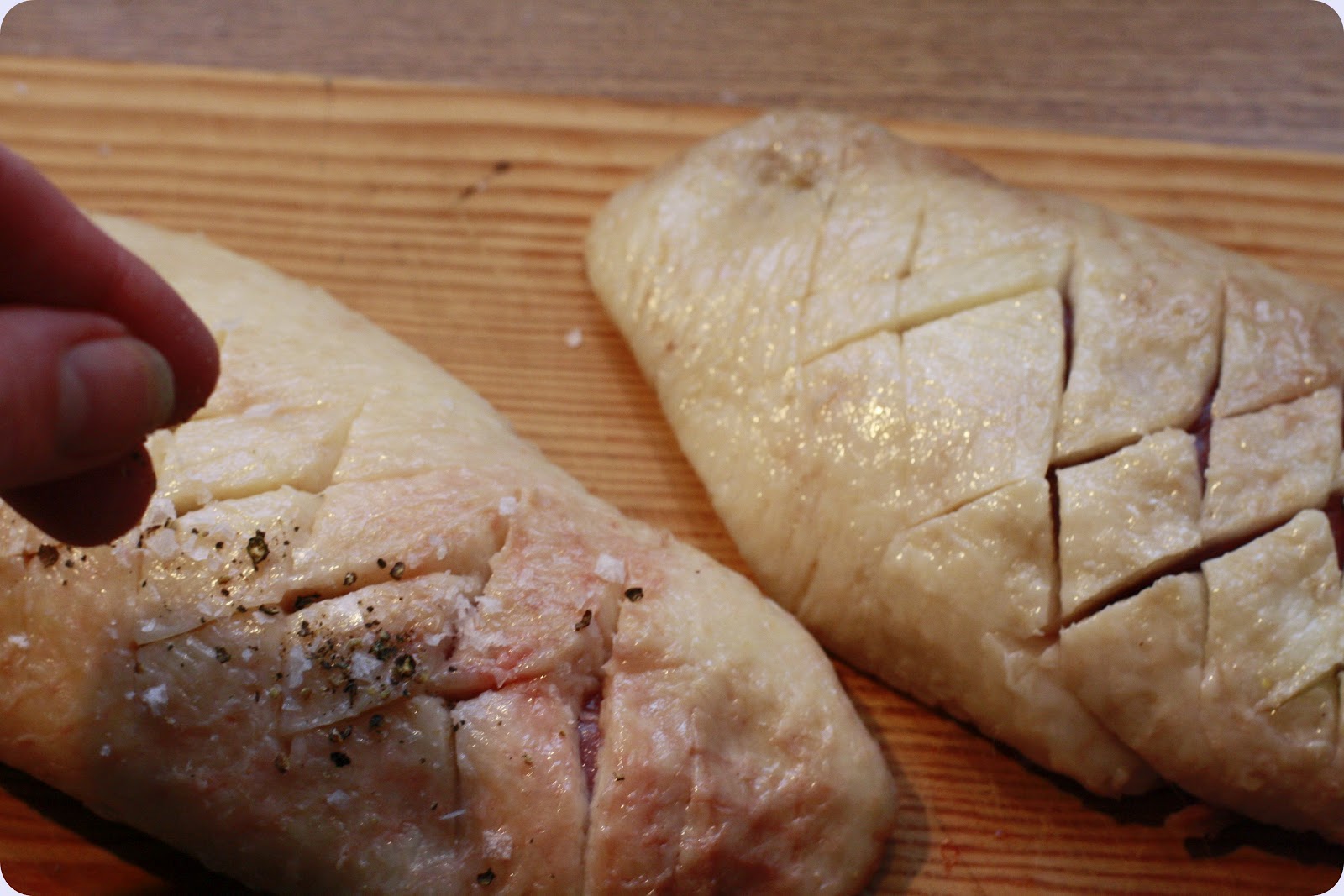 Snitt opp skinnet, krydder godt med salt og pepper.