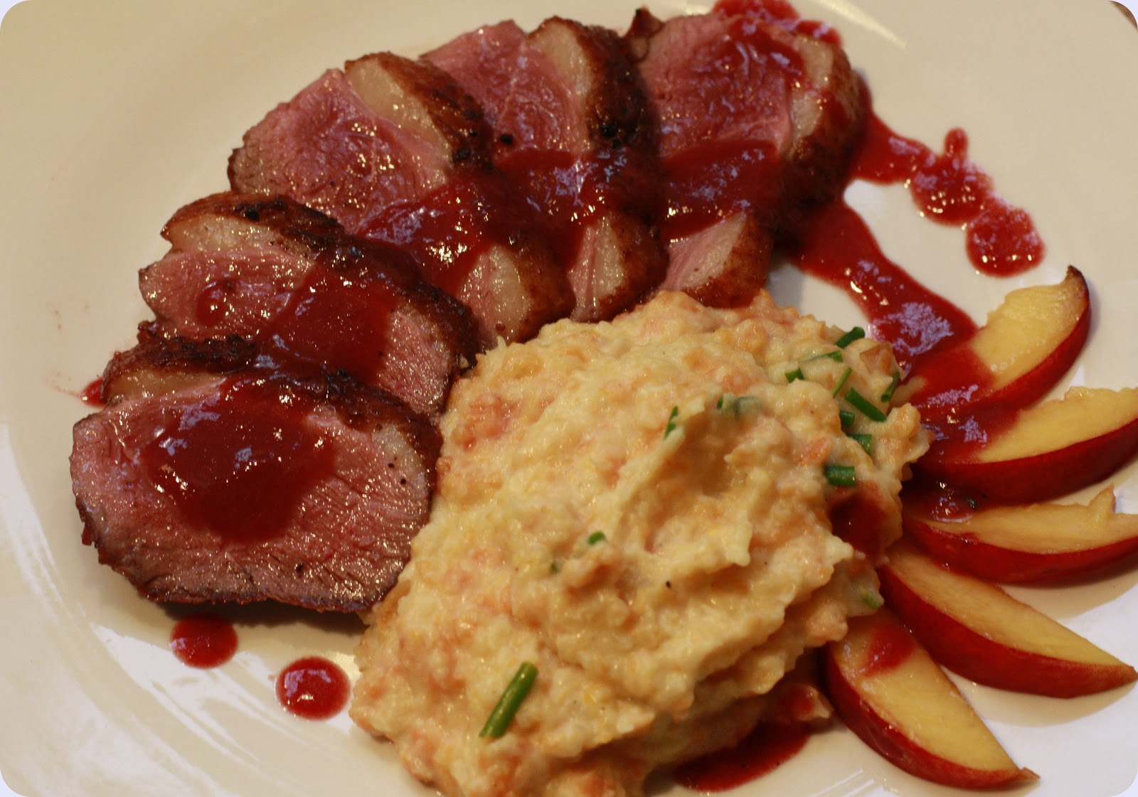 Server skiver av andebryst med rotmosen, den røde sausen og nekarinskiver til.
