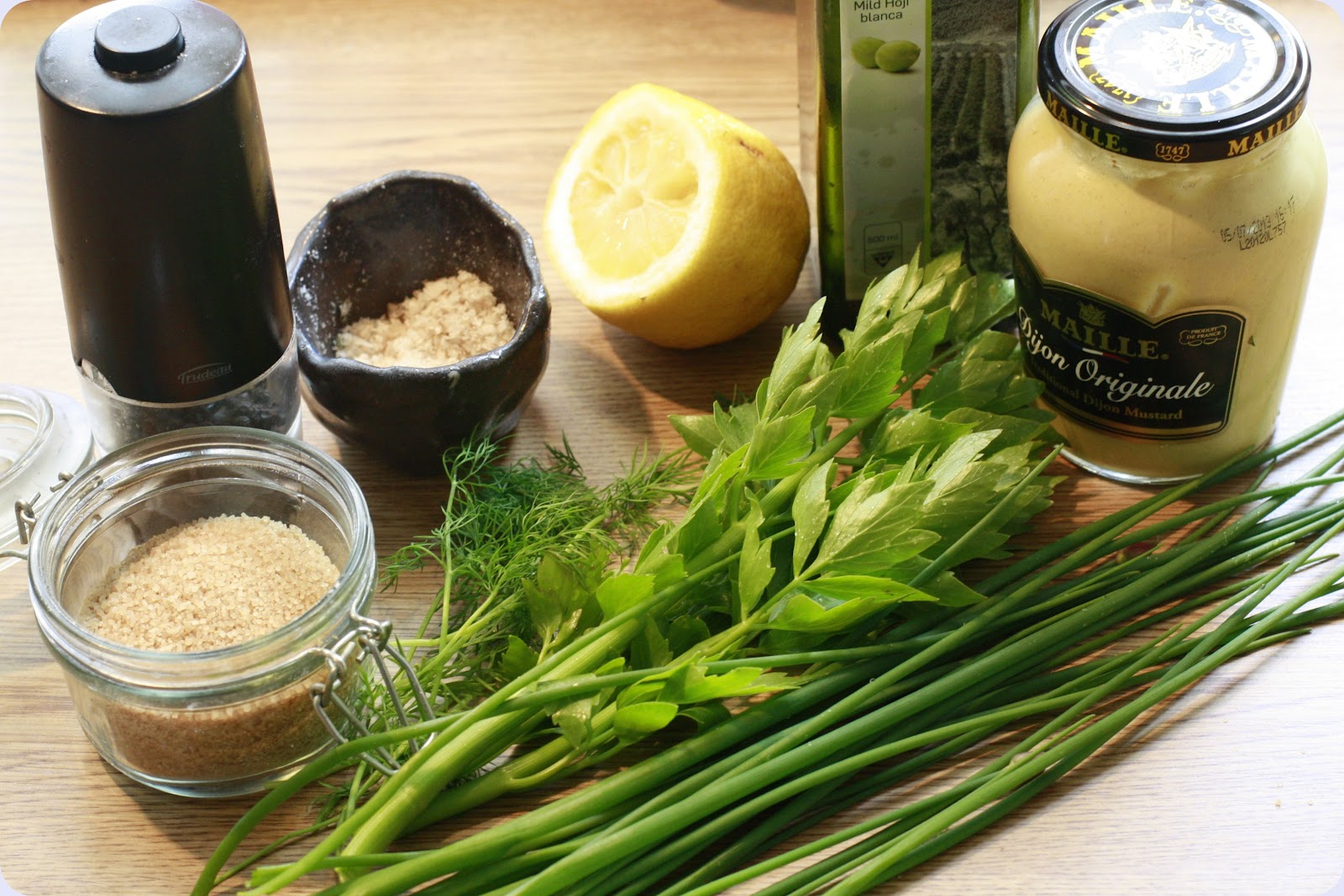 pepper, sennep, olje og sitronsaft.