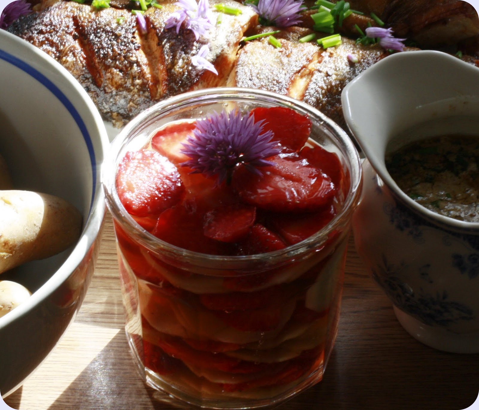 Agurk og jordbærsalat passer godt til nystekt ørret.