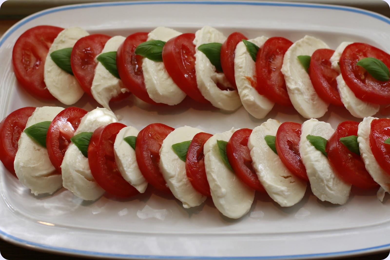 Legg tomat, mozzarella og basilikumblader lagvis på et fat.