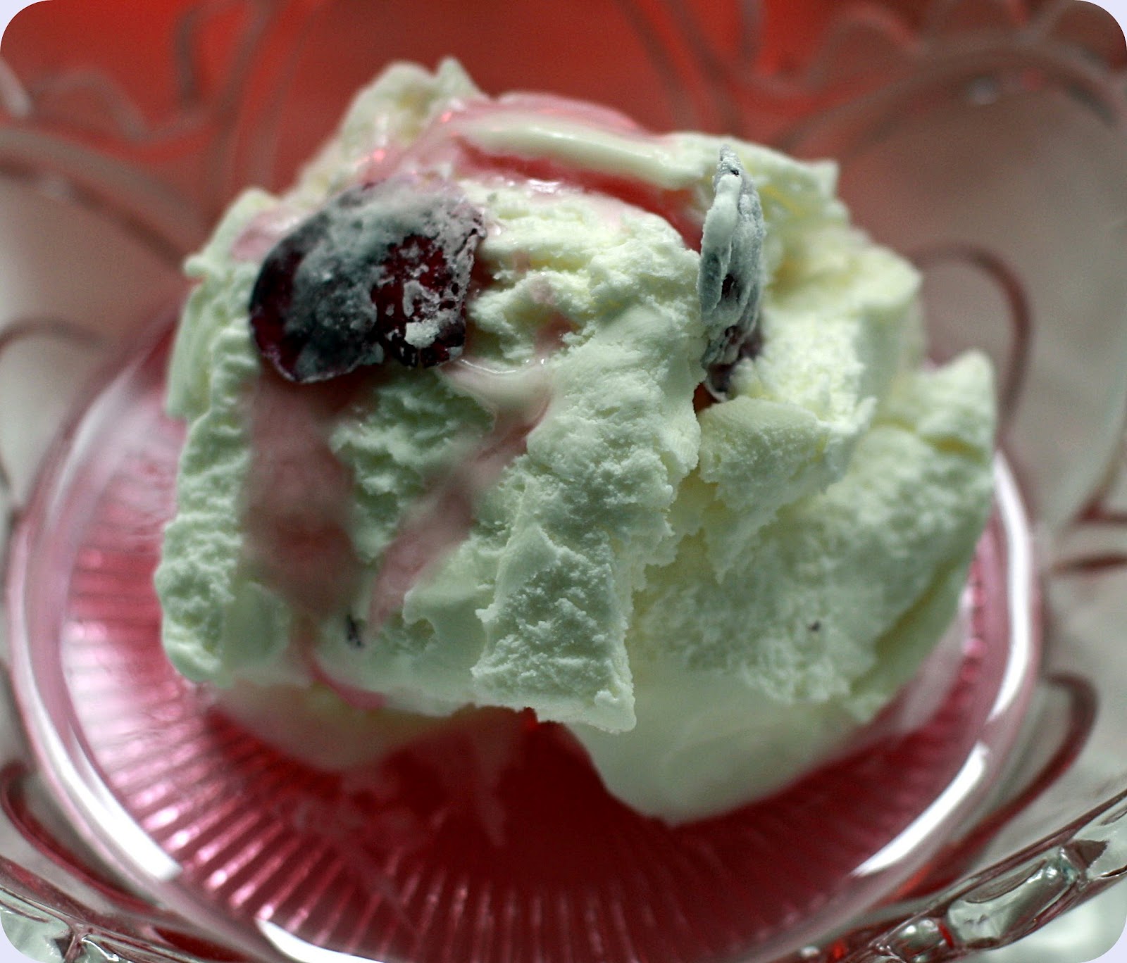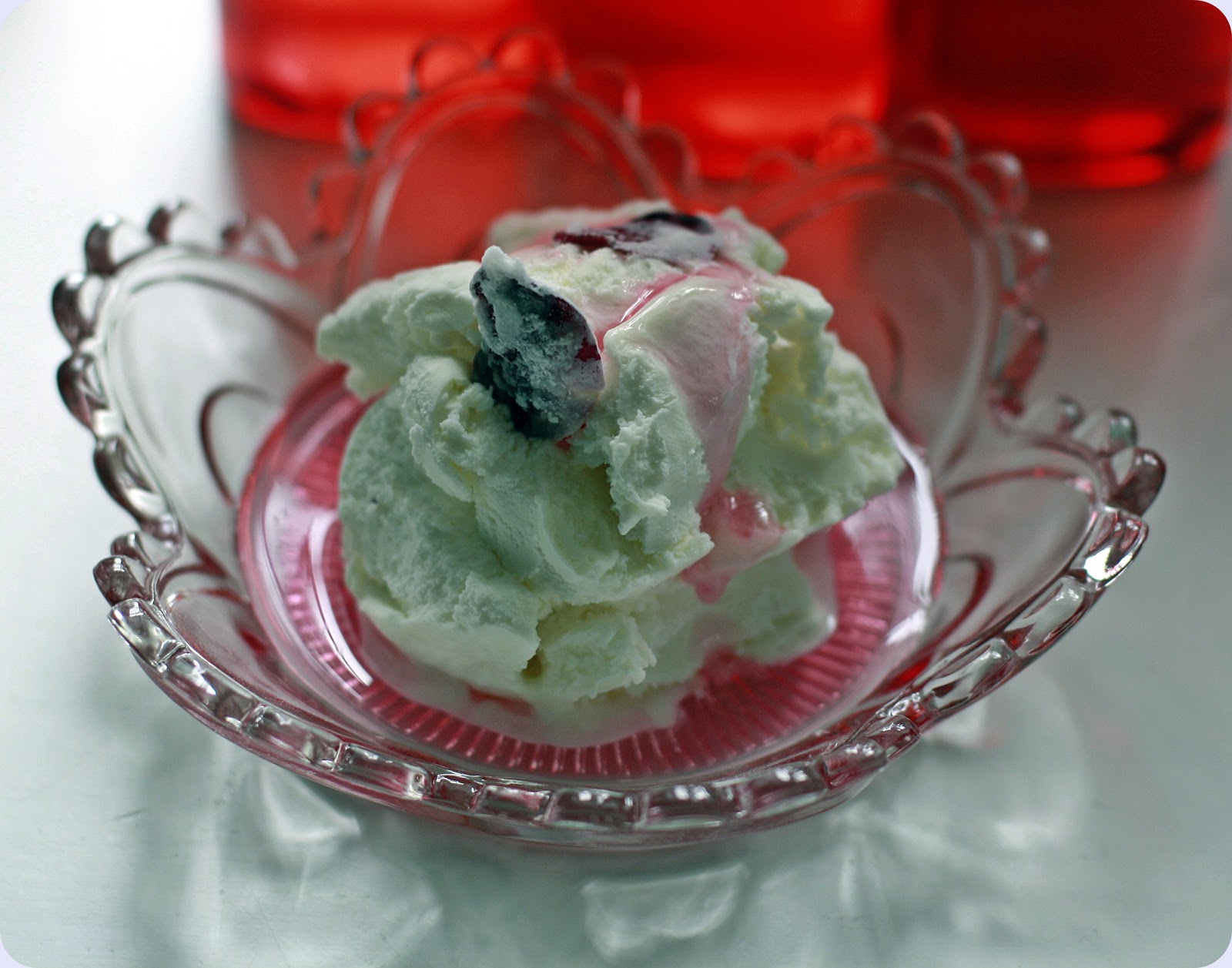 Vaniljeis med rosesirup og sukrede rosenblader,