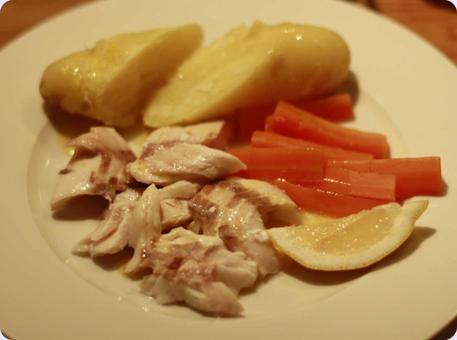 Server den saltbakte ueren med kokte poteter, gulrot og smeltet smør.