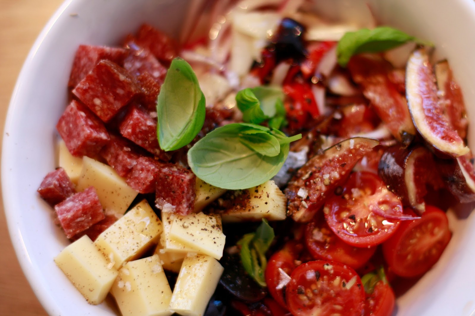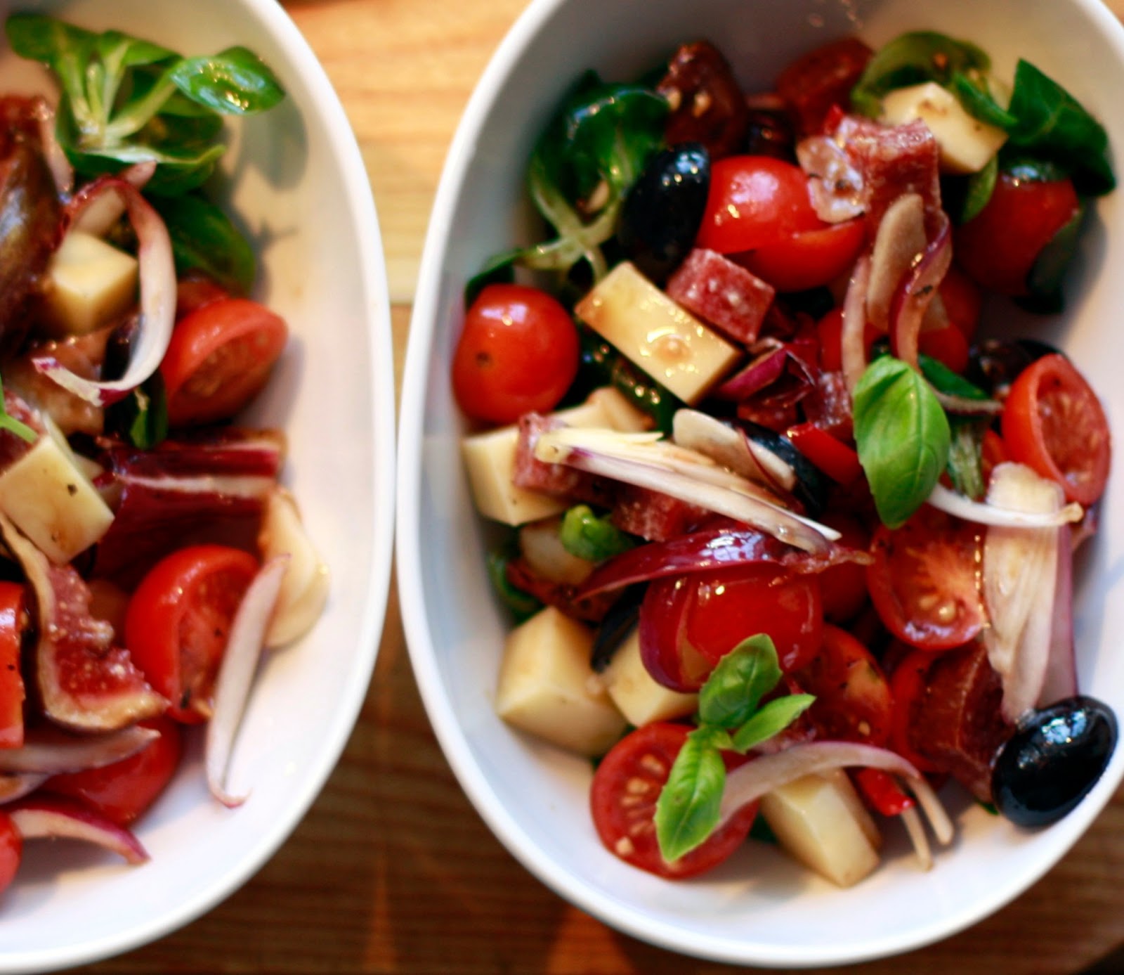 Del opp ost og spekepølse i terninger, del tomat og druer i to.