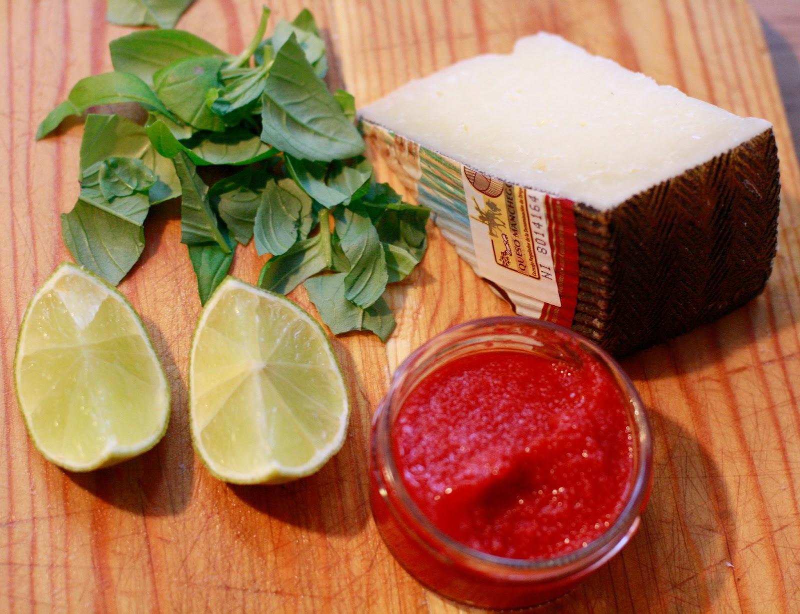 Tilbehør: Limebåter, lodderogn, basilikum og god ost.