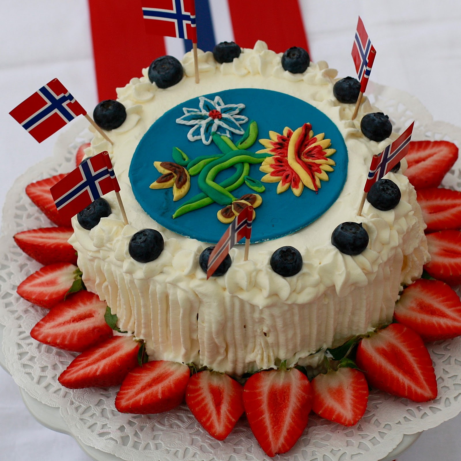 Legg halve jordbær rundt kaka og pynt med blåbær og flagg.