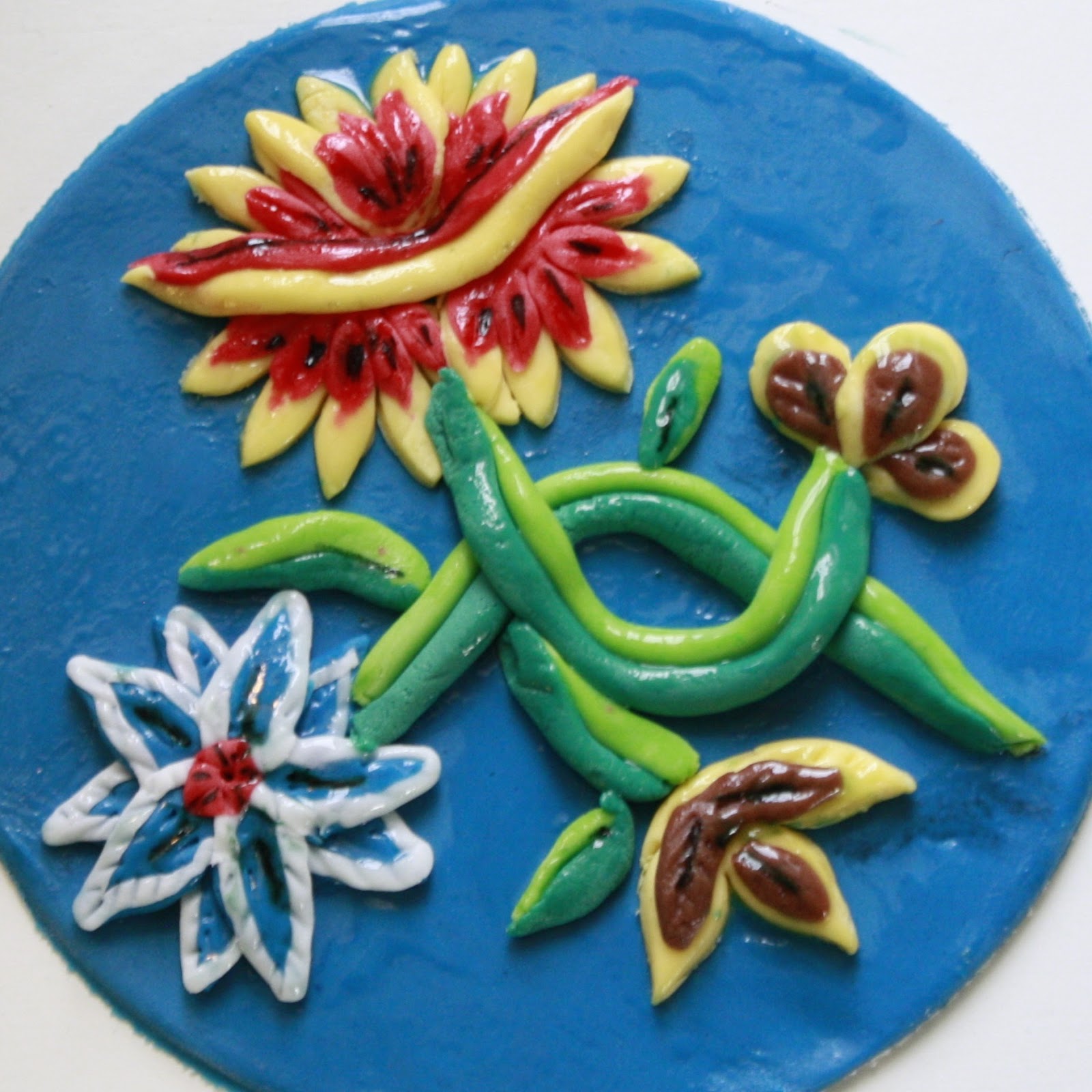 Blå, rød, gul, brun, lys og mørk grønn og hvit fondant.